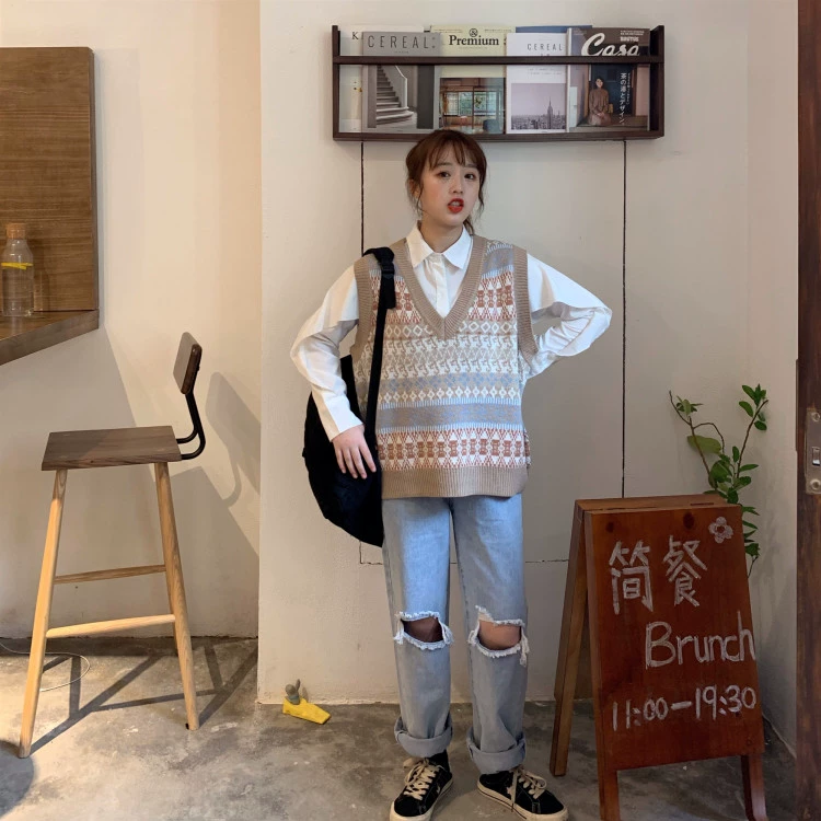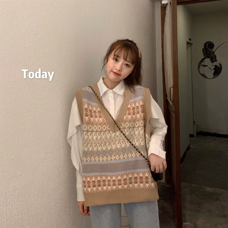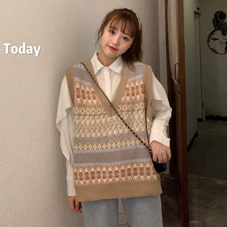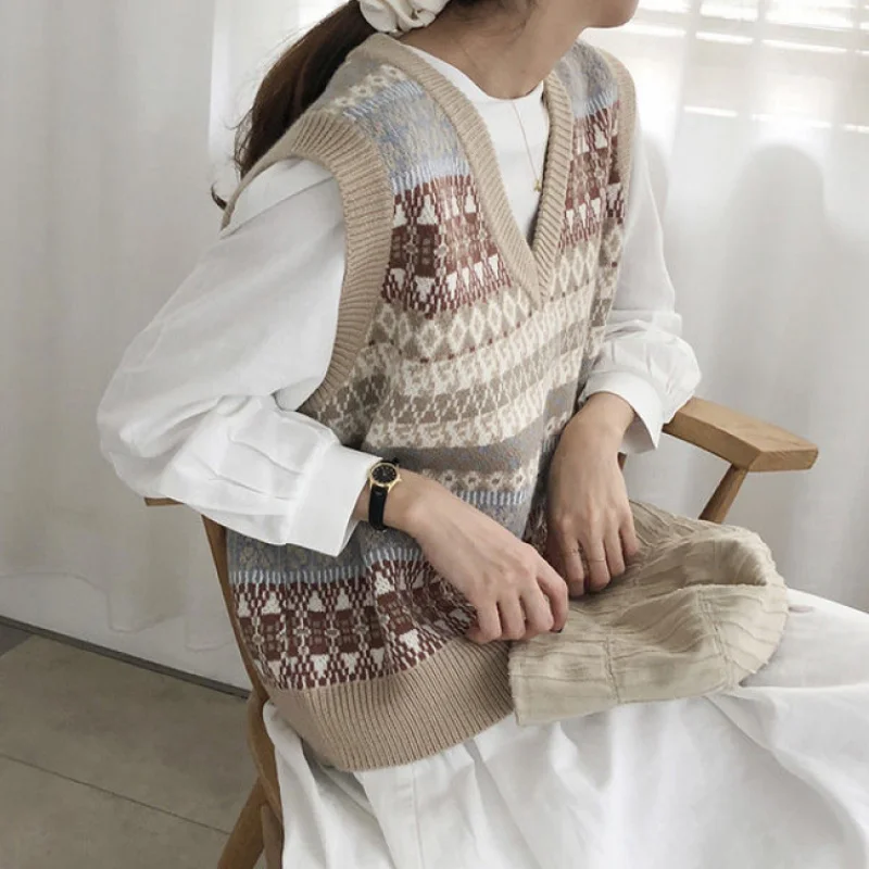 Женский винтажный свитер-жилет с принтом и V-образным вырезом
