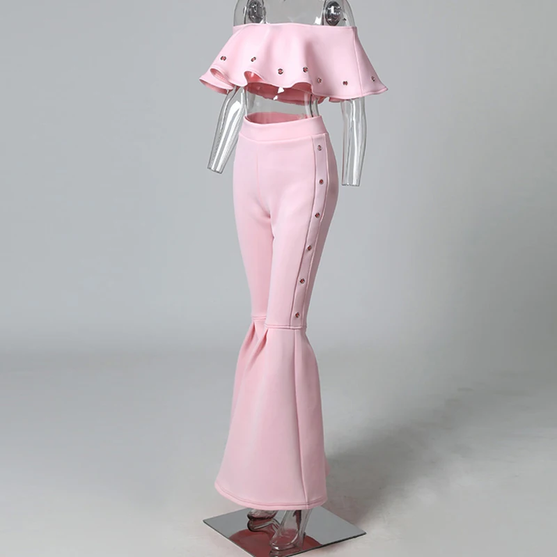 Женский костюм-двойка с открытыми плечами, топ с оборками и расклешенные штаны, летний клувечерние праздничный костюм