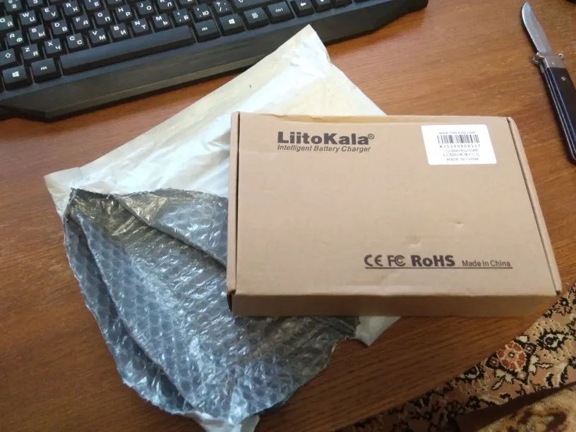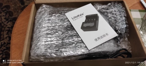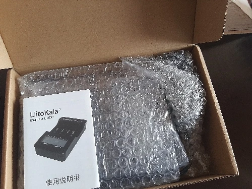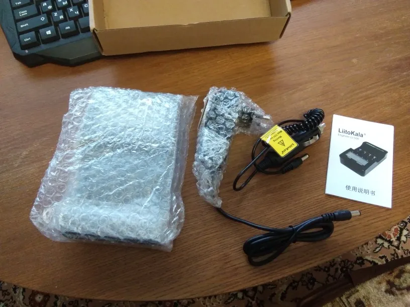 Картонная коробка с минимальным оформлением, зато внутри всё в пакетах из пупырки - очень правильное решение. Есть мануал на китайском, английском и русском языках. Пробую перезарядить щелочной аккумулятор. Впечатление, что возможно. На других - не получилось.