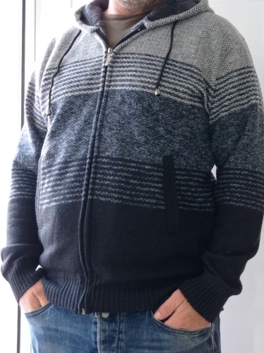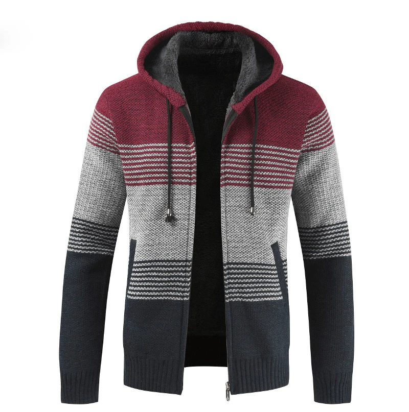 Мужской утепленный кардиган с капюшоном, полосатый флисовый свитер с шерстяной подкладкой и молнией, на зиму, 2022