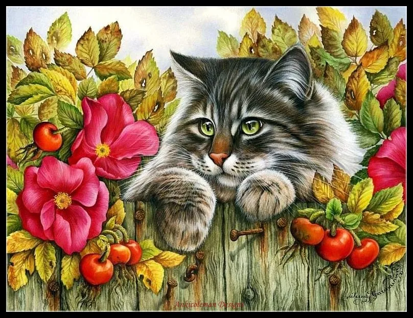 Набор для вышивания котом, животными, садом, цветами, 14 карат