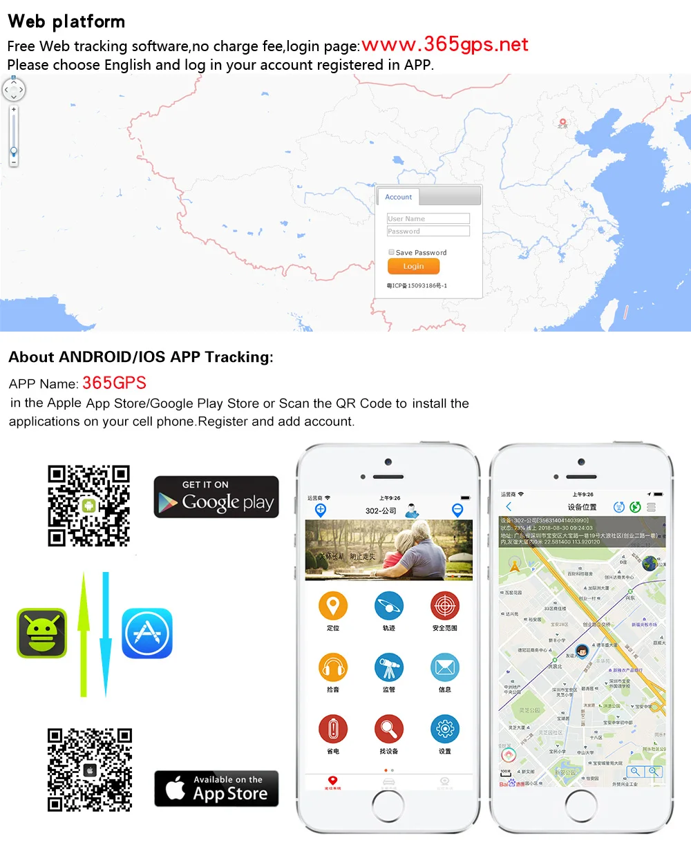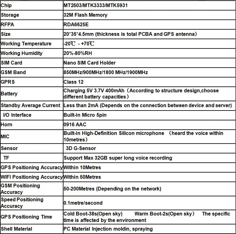 GPS/A GPS/WIFI/LBS позиционирование в реальном времени SOS Голосовой мониторинг Семейные номера звонков Шагомер Напоминание о тревоге гео-забора Историческая дорожка Будильник Режим класса Режим энергосбережения 1 * Главный блок GPS 1 * Руководство пользователя (Не включает sim-карту!).