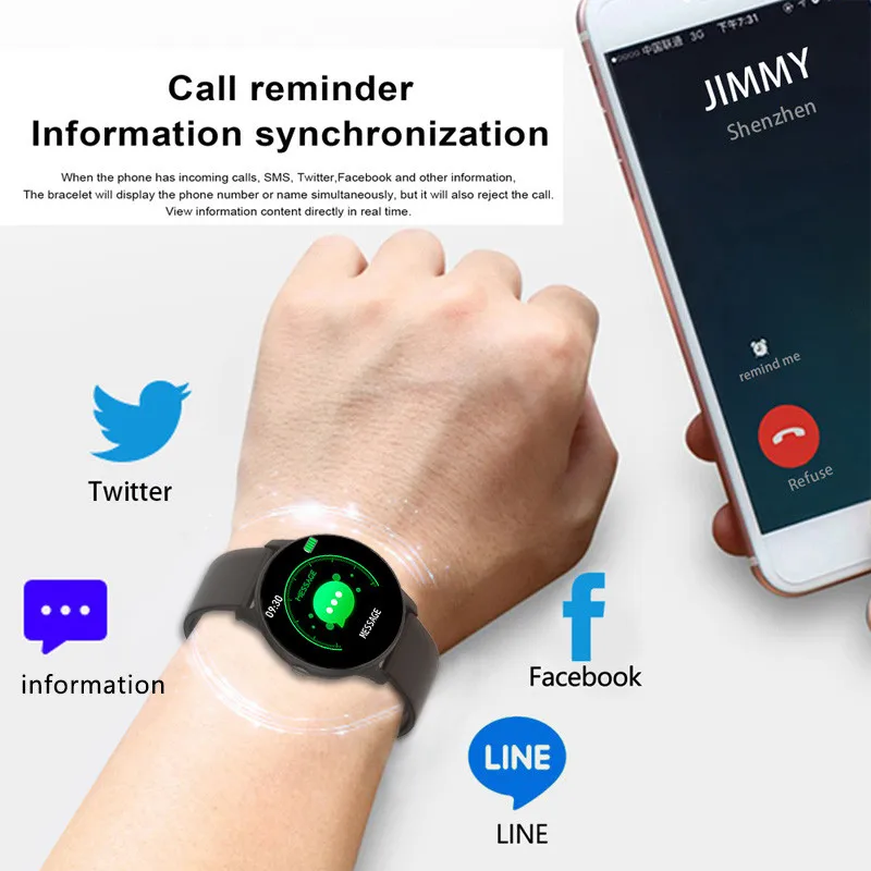 ● Поддержка сигнализации, питья воды, сидения, звонков, SMS (сообщения, QQ, Wechat, Skype, Facebook, Twitter, Line, Whatsapp), напоминания о потере. Часы будут напоминать вам вибрацию.