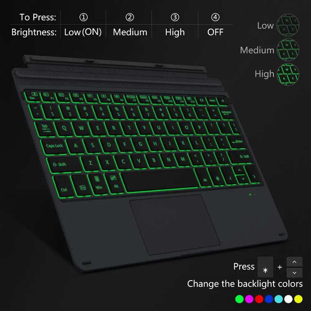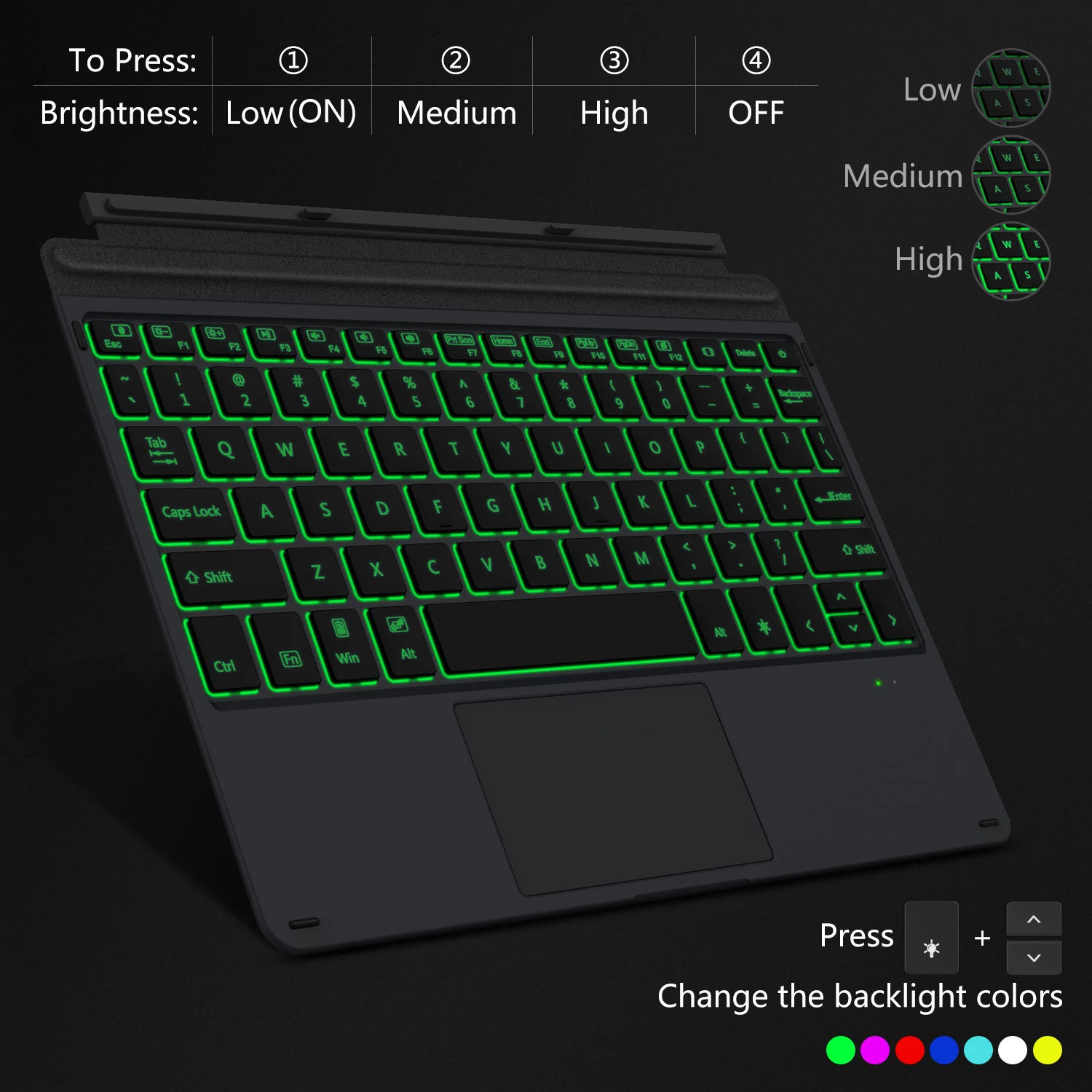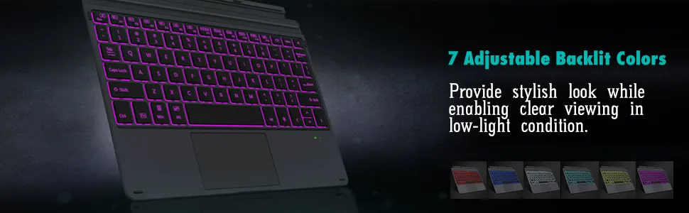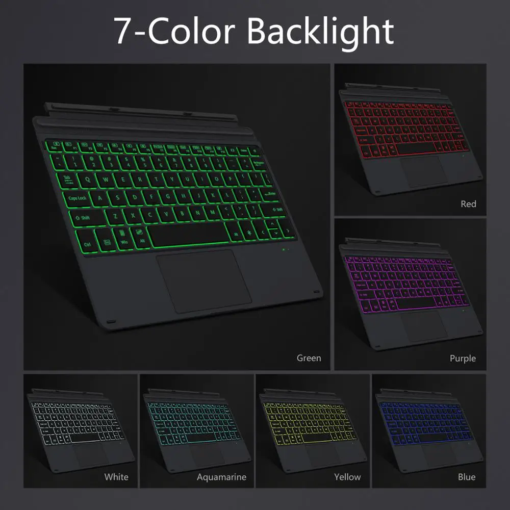 Совместимость-предназначен дляMicrosoft поверхности Go 10 дюймов [2018] /поверхности Go 2 10,5 дюймов [2020] /поверхности Go 3 10,5 дюймов [2021].. С слегка разложенными клавишами для более привычного и эффективного набора текста, который кажется традиционным ноутбуком. Клавиатура крепкая с усиленной магнитной стабильностью вдоль сгиба, так что вы можете настроить ее под прямым углом и работать на коленях, на самолете или на вашем столе.7-цветная подсветка-Специальный светодиодный фонарь 7 цветов, каждый цвет имеет 2 уровня яркости. Идеально подходит для набора текста свободно даже в условиях низкой светильник условий или в темное время суток.Встроенный трекпад с чувствительным трекпадом, удобно использовать как мышь, точно перемещаться и управлять планшетом, дает вам опыт работы с сенсорным экраном, не отрывая руки от клавиатуры.Работает с беспроводным-легко соединять с вашим устройством по беспроводной связи с диапазоном до 33 футов, предлагая вам удобный ввод текста.Аккумуляторная батарея-Эта клавиатура имеет встроенный литиевый аккумулятор 750 мАч, 60 часов непрерывного использования без подсветки (5 часов с подсветкой).