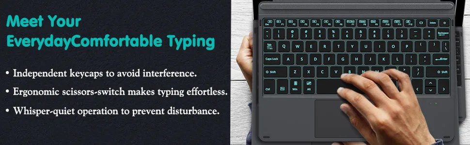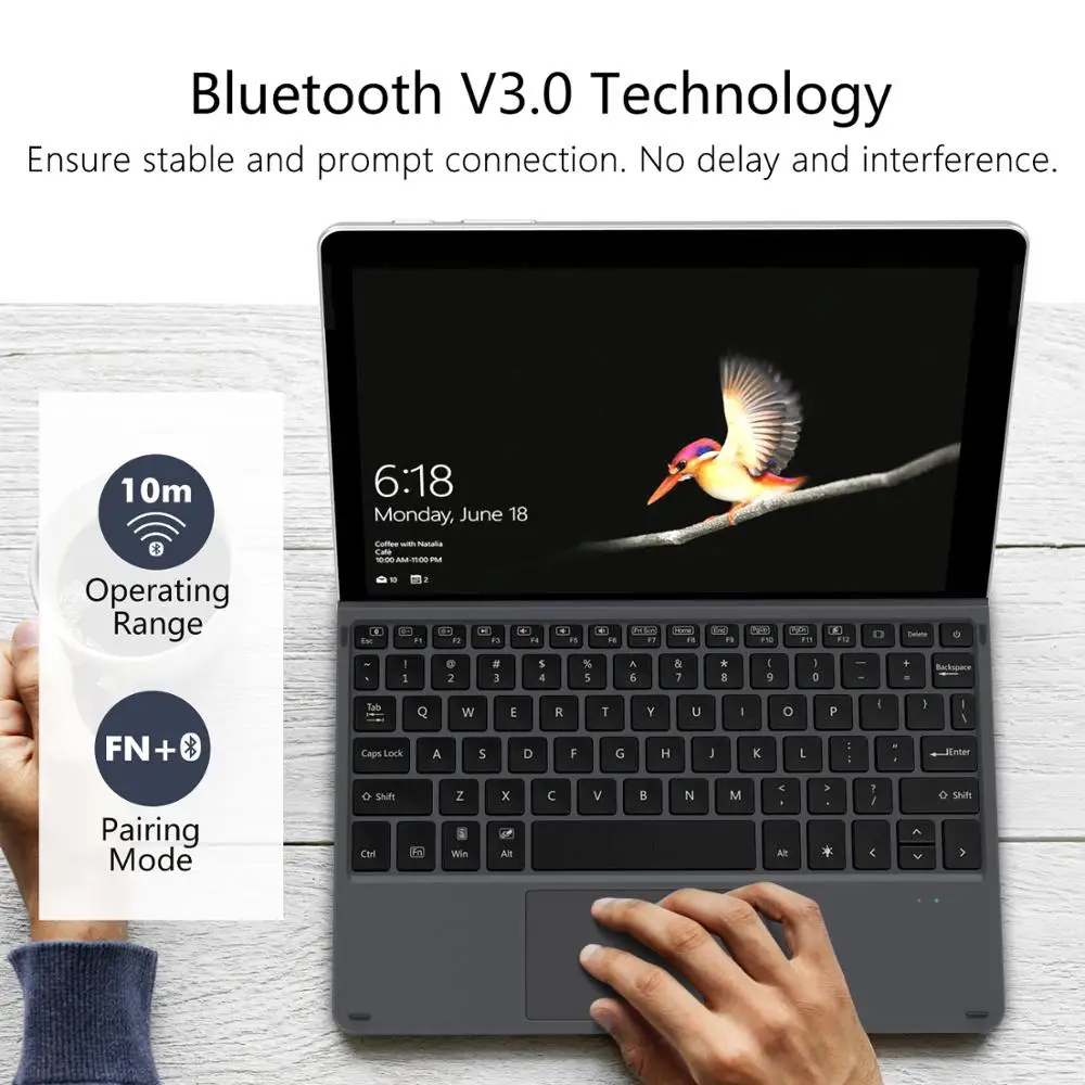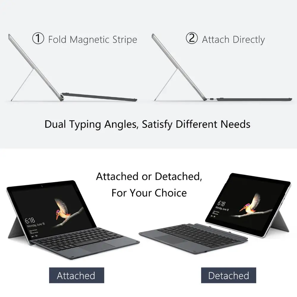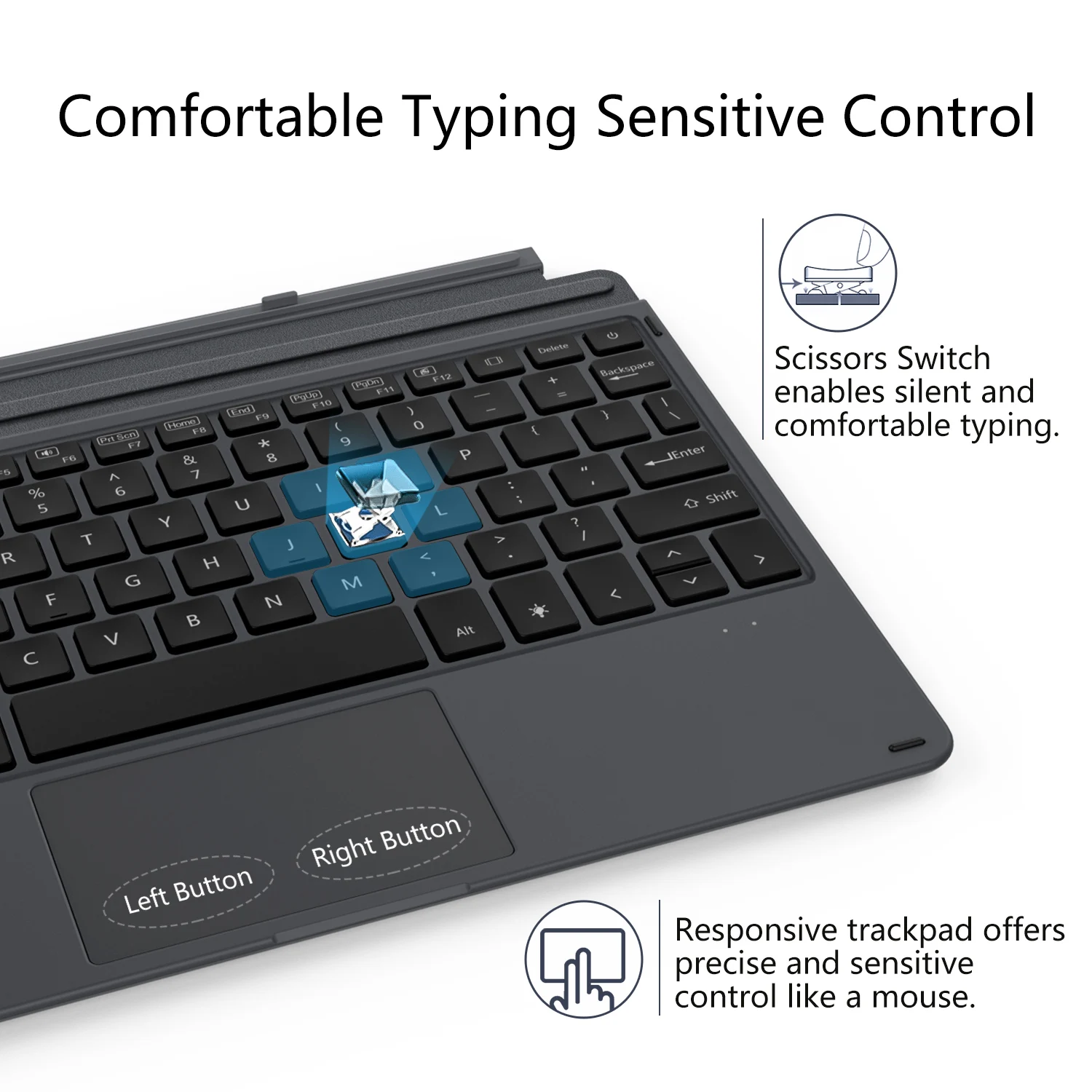 Совместимость-предназначен дляMicrosoft поверхности Go 10 дюймов [2018] /поверхности Go 2 10,5 дюймов [2020] /поверхности Go 3 10,5 дюймов [2021].. С слегка разложенными клавишами для более привычного и эффективного набора текста, который кажется традиционным ноутбуком. Клавиатура крепкая с усиленной магнитной стабильностью вдоль сгиба, так что вы можете настроить ее под прямым углом и работать на коленях, на самолете или на вашем столе.7-цветная подсветка-Специальный светодиодный фонарь 7 цветов, каждый цвет имеет 2 уровня яркости. Идеально подходит для набора текста свободно даже в условиях низкой светильник условий или в темное время суток.Встроенный трекпад с чувствительным трекпадом, удобно использовать как мышь, точно перемещаться и управлять планшетом, дает вам опыт работы с сенсорным экраном, не отрывая руки от клавиатуры.Работает с беспроводным-легко соединять с вашим устройством по беспроводной связи с диапазоном до 33 футов, предлагая вам удобный ввод текста.Аккумуляторная батарея-Эта клавиатура имеет встроенный литиевый аккумулятор 750 мАч, 60 часов непрерывного использования без подсветки (5 часов с подсветкой).