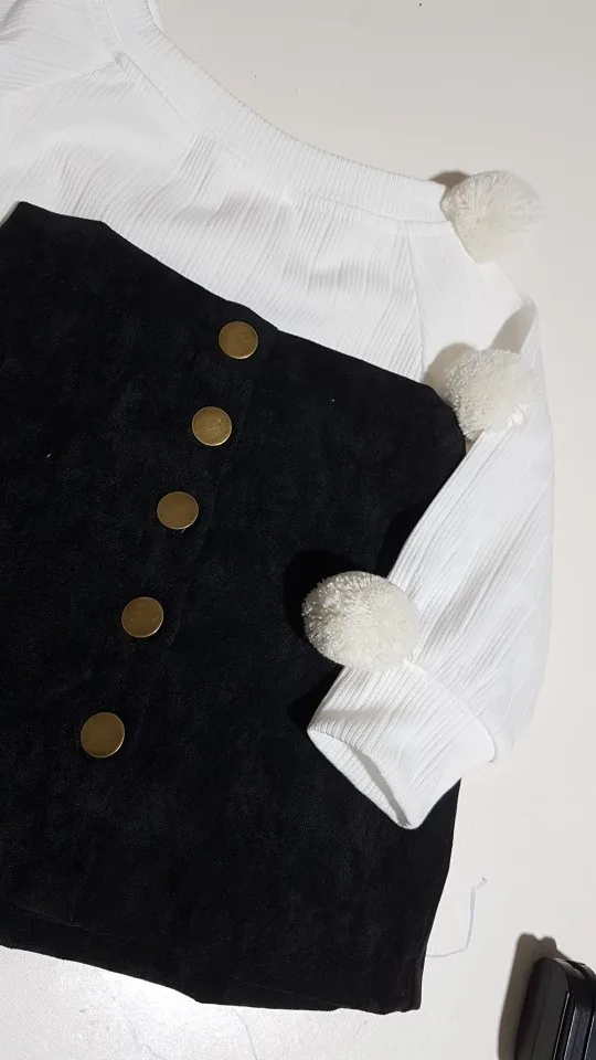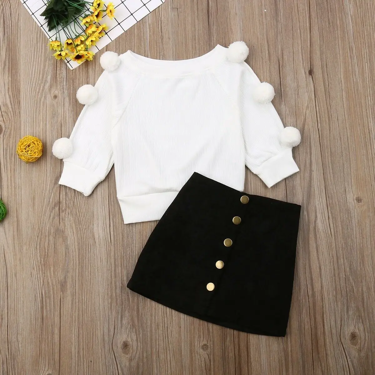 Осенне-зимняя одежда для маленьких девочек, Вязаный топ с меховым помпоном + мини-юбка на пуговицах, теплые комплекты одежды, От 1 до 6 лет
