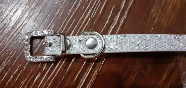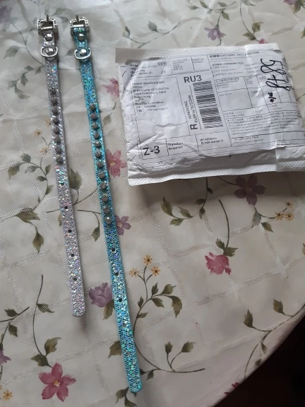 Ошейник прибыл из Китая в Воронеж за 18 дней. Качество хорошее. Ровные строчки. Все стразы на месте. Но вот мельчайшие блестки с самой фактуры ошейника осыпаются как конфетти. Возможно, это временно и не все осыпется )) Материал ошейника жестковат на мой взгляд. Для моей собаки весом 3 кг ошейник размера xs оказался маловат. Застегивать ошейник можно только на последней дырочке.