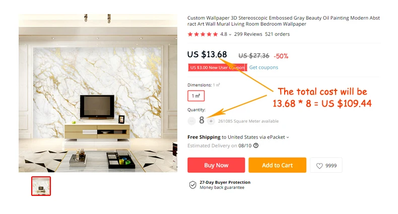 Требуется 8 м², общая стоимость будет 13,68*8 = $109,44