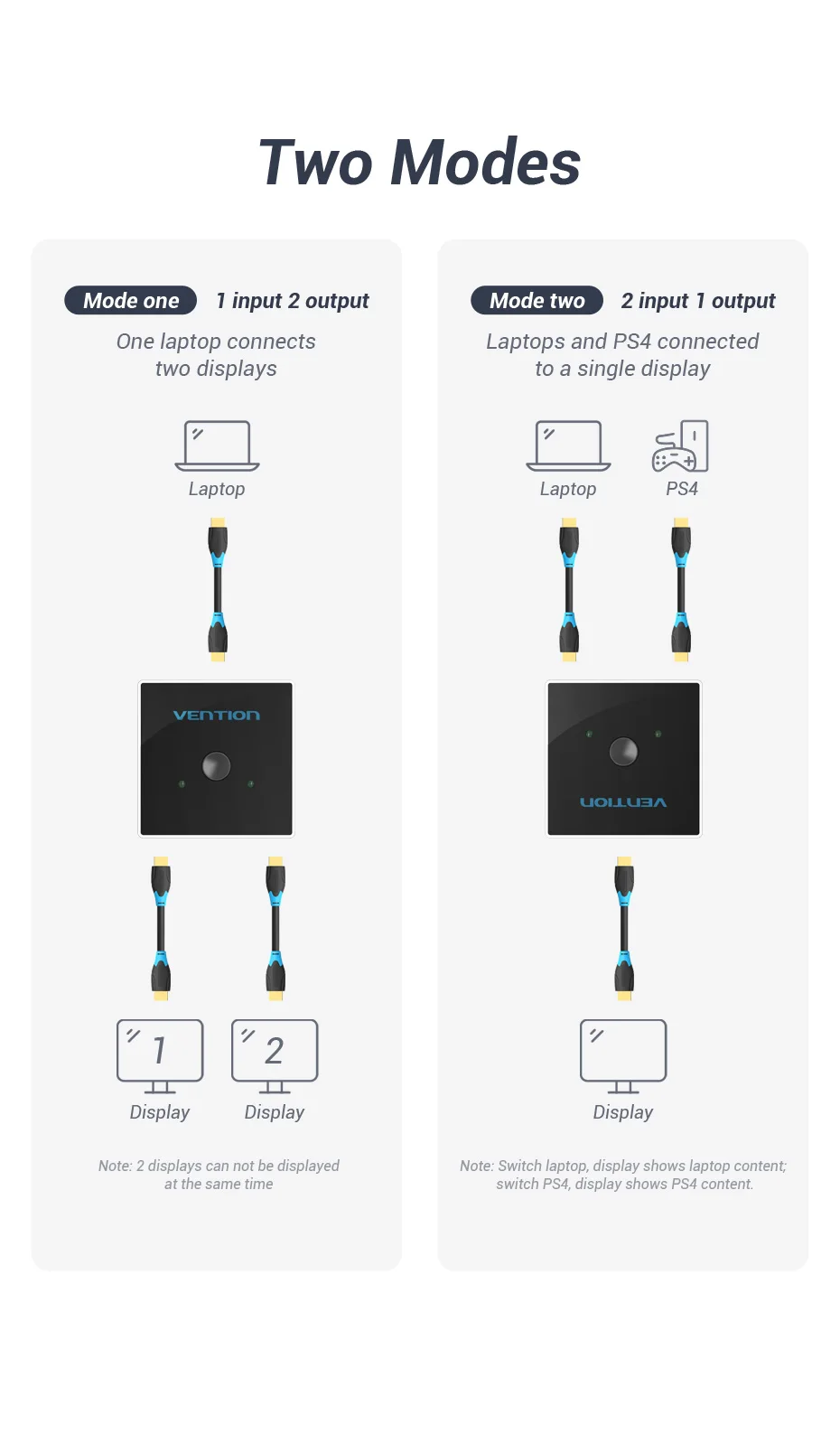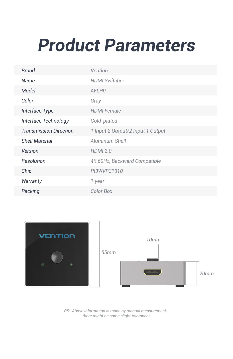 1. Этот переключатель HDMI прост в настройке и эксплуатации. Не требуется внешний источник питания, просто подключите устройства HDMI, чтобы наслаждаться! Простое нажатие кнопки для замены сигнала в течение одной секунды, и светодиодный светильник показывает, какой порт активен. 2. Прочная конструкция из алюминиевого сплава, прочный двунаправленный разветвитель HDMI помогает подключить два источника HDMI к одному дисплею HDMI или подключить один источник HDMI для переключения между двумя дисплеями (два экрана не могут отображаться одновременно). 3. Переключатель HDMI обеспечивает высокую пропускную способность передачи данных 18 Гбит/с, Отсутствие задержек, отсутствие потери качества изображения или звука. (Кабель HDMI в комплект не входит) 4. Поддержка 3D,4K x 2K @ 60hz 1080P @ 60Hz, разрешение и HD аудио, с этим HDMI-переключателем вы можете наслаждаться самым роскошным видео и аудио. (Для подключения Используйте стандартные кабели HDMI 2,0) 5.HDMI сплиттер-переключатель подходит для большинства устройств со стандартным интерфейсом HDMI. Вход: компьютер, XBox 360, XBox One, PS3 / PS4, Blu-Ray DVD-плеер, маршрут года, Chromecast, ПК и т. д. Выход: HD-Ready, Full HD TV s, Apple TV, мониторы, проекторы и т. Д.. 6. Напоминание: если вы хотите, чтобы продукция достигала 4 К60 Гц, только при условии, что ваше устройство поддерживает 4 К60 Гц, а Кабель HDMI-менее 2 м.