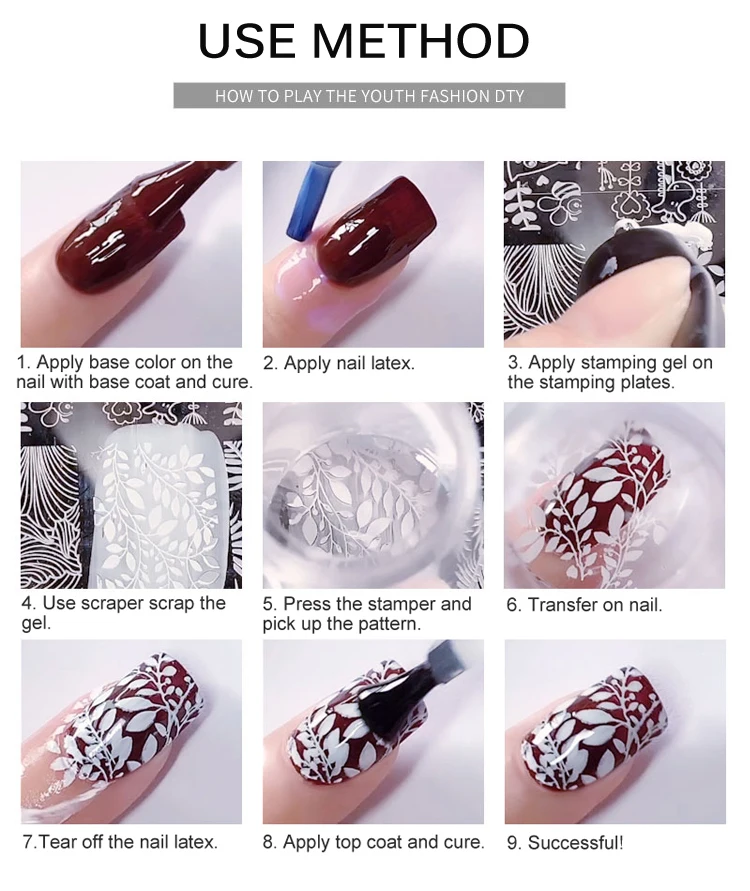 1. Нанесите базовый цвет на ноготь с помощью базового покрытия и лечения.2. Нанесите латекс для ногтей BP.3. Нанесите BP штамповочный гель на штамповочные пластины.4. Используйте прозрачный гель.
