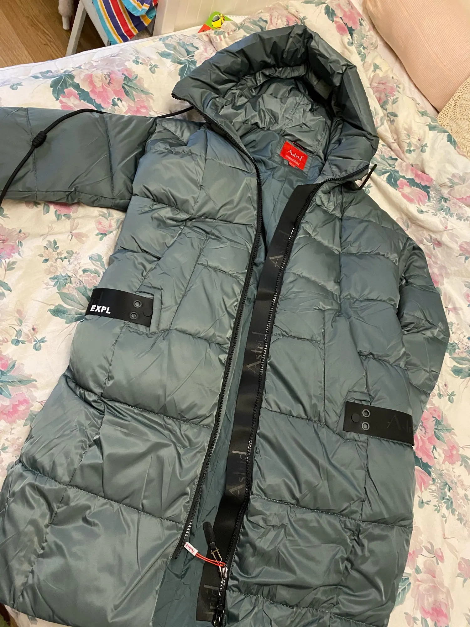 Пух пришел быстро за 3 недели, получала в ближайшей пятерочке, понравилось. Не надо на почте этой адской стоять в очереди)) размер выбирала по отзывам, спасибо девочки. На окружность груди 110 взяла xxl или евр 46, сидит как оверсайз, думаю на размер меньше тоже норм сел бы, так как 46 чуть в плечах свободней, чем хотелось бы, в остальном хорошо все. На рост 164 ниже колена на ладонь , рукава с отворотами норм, высоким нужно отвороты отогнуть, в них запас 6-8 см, и будет ок. Капюшон глубокий, затягивается. Не скажу, что пух прям легкий совсем, но не тяжелый, средний по весу.