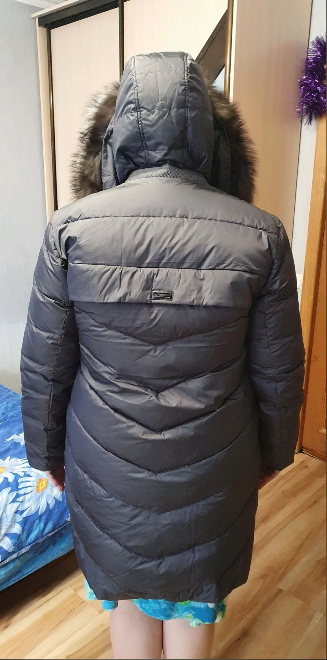 Пуховик размера 3XL, по совету продавца, заказывала на рост 164 см, вес 90 кг, огружность груди 118, окружность бёдер 118, окружность талии 100, ширина плеч 48 см. Пуховик подошёл по размеру, меряла на водолазку, тёплый свитер не надеть, в бёдрах свободно, а вот в груди и руках запаса мало, то есть если носить его в регионах южнее Москвы, где достаточно поддеть по пальто тонкий джемперок, всё отлично, а вот северянам надо брать на размер больше. Пуховик очень тёплый, лёгкий, наполнитель распределен равномерно, совсем не полнит, капюшон глубокий, карманы не застегиваются, достаточно глубокие, молния расстегивается и снизу и сверху, что важно, так как модель зауженная и чтобы забраться в транспорт надо расстегнуть снизу молнию. Пошит пуховик отменно, очень качественный продукт. Надо обратить внимание, что на фото продавца пуховик белый, но в реале цвет серовато-бежевый.