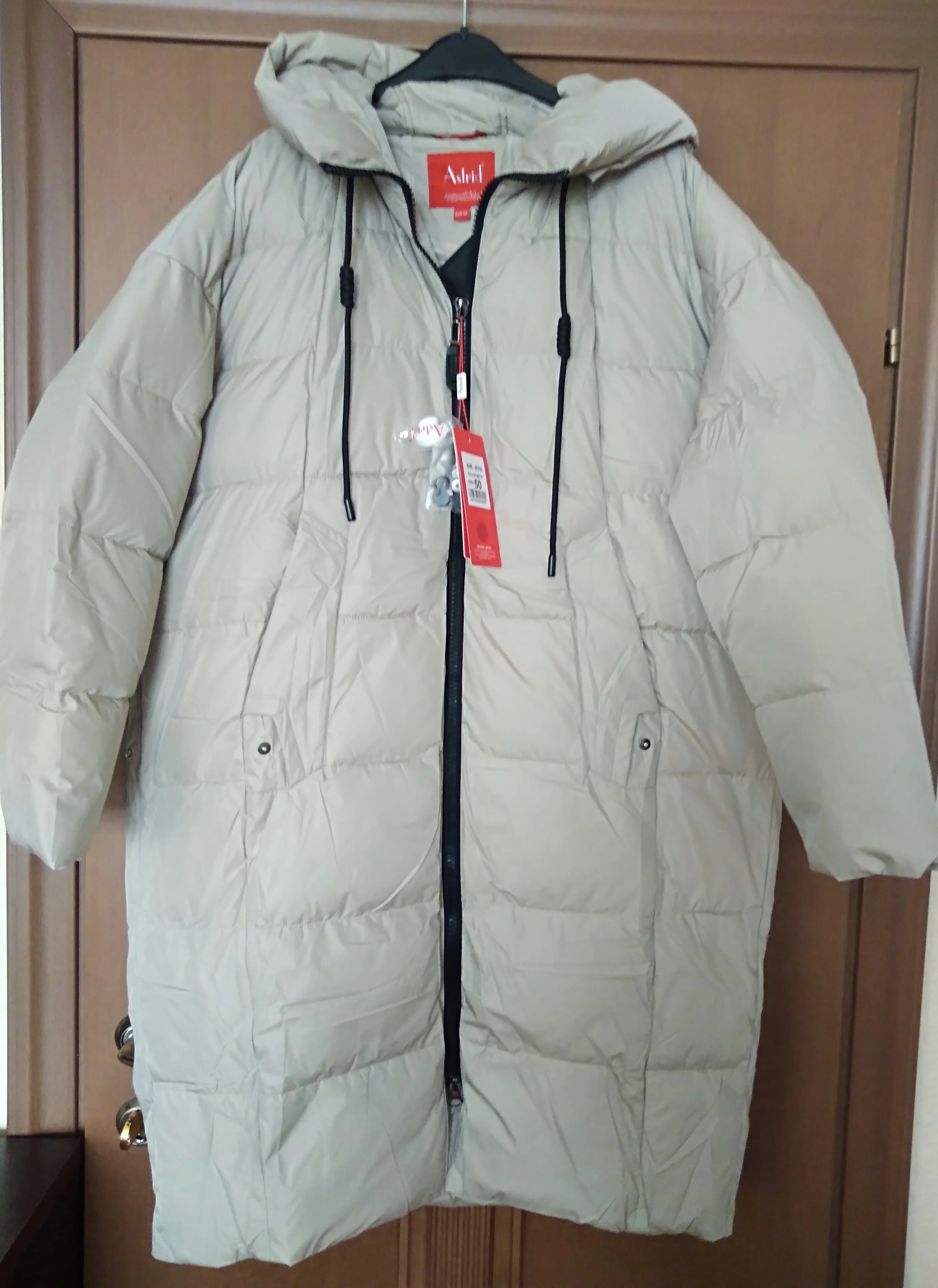 Мои точные размеры: Рост 167 см, окружность груди 118 см. Бедра и талия в данной модели роль не играют. Заказала 4XL , его мне посоветовал продавец, за что огромное спасибо! Сделала измерение у пальто, по груди - 132см!!! Примите к сведению и оно от этой разницы (132-118 = 14 см) не стало огромным, не забывайте, что наполнитель занимает сантиметры. Подошло хорошо, даже видно на фото, что свободненько. Главное рукава длинные. Легкий, мягкий, цвет не чисто белый, а как на моем фото , на двери, серо - молочный, не пойму, но нормально. Капюшон затягивается, что плюс. Черные полоски по бокам убрала сразу, хочу на них связать из шерсти клапаны, пришить и потом пристегну. Пальто понравилось. Спасибо, кто его сшил!