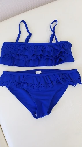 Купальник красивый, благородный цвет. Доставка очень быстрая, до Москвы дней 10. Заказала размер 11-12 на крупную девочку 8 лет (рост 140)...маловат, особенно трусы. Больше подходит на стройных (на фото сравнение с другим купальником, который на 10-12 лет:)
