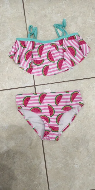 На рост 134 размер 9-10 бюстик по объему впритык,трусики свободно,хотя дочка пропорционально сложена. Рисунок с арбузами. Сшит хорошо,застёжка пластиковая,надёжная.