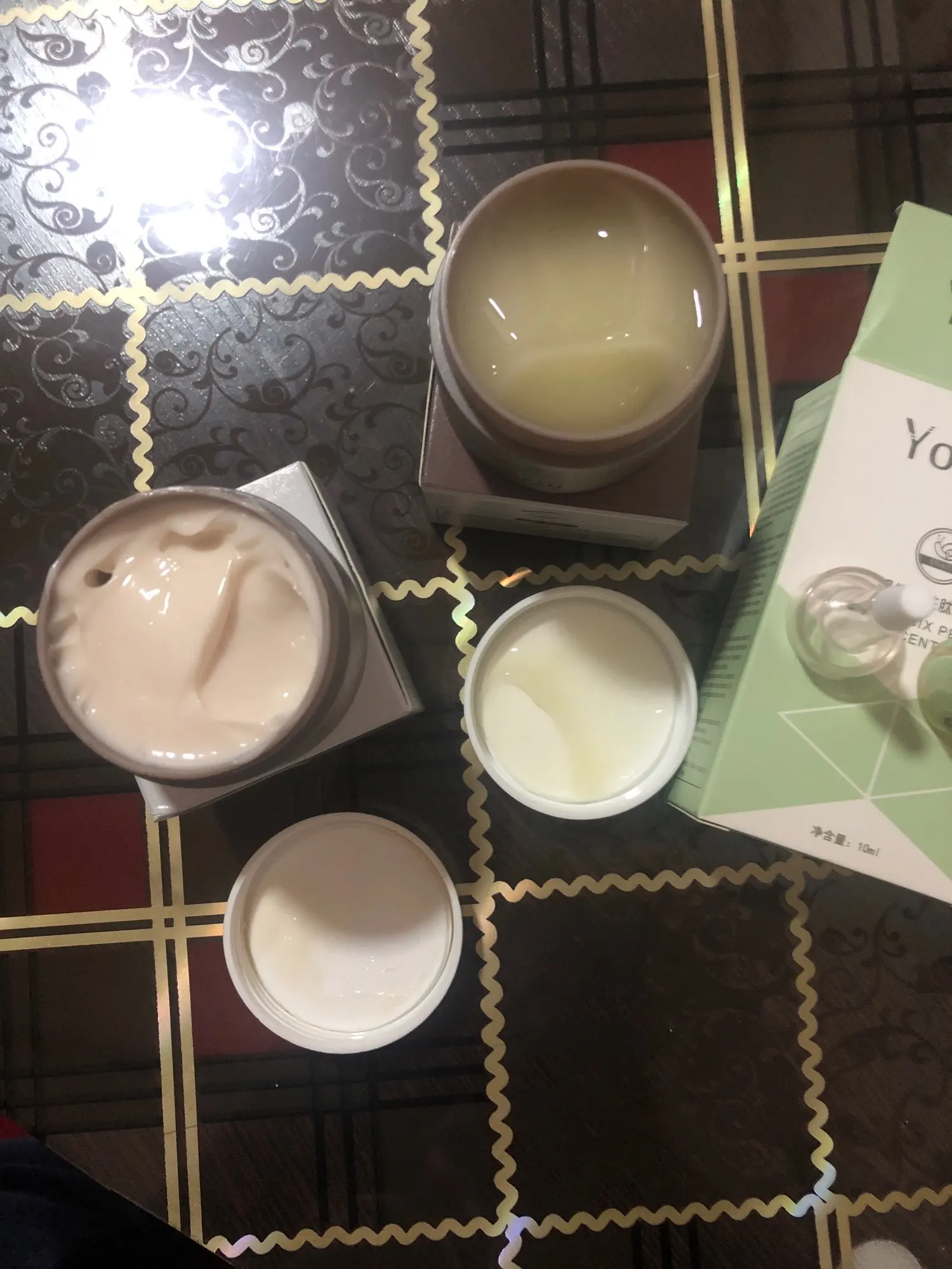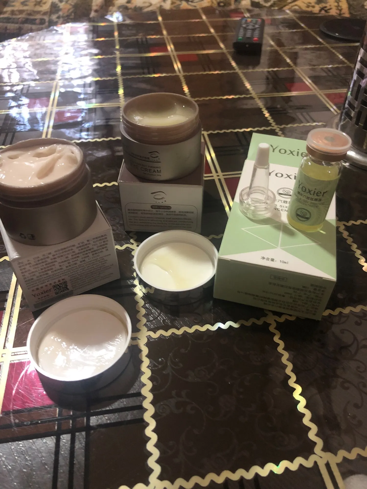 Набор пришёл за 7 дней . Баночки и ампула маленькие, но расход очень экономичный. Впитывается все очень хорошо. Липкий слой не оставляет. Завах умеренный, приятный. Перевод только на английском. Эффект пока сказать не могу нужно время.с продавцом не общалась. Всё было понятно