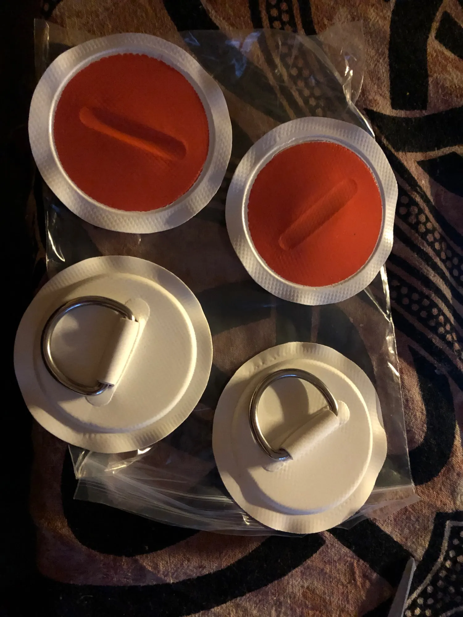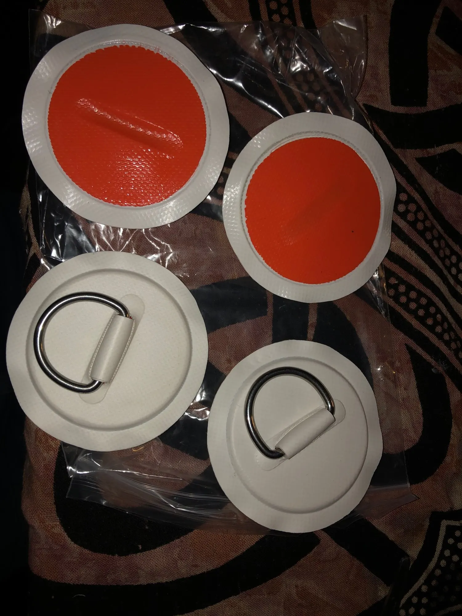 Пришли 4 белые накладки, свищу довольно-таки приличные, диаметр окружности около 8 см. С обратной стороны вставки оранжевого цвета - уж не знаю, просто так или материал другой для лучшего сцепления с ПВХ (материал не похож на тот, что используется для ремонта велопокрышек). С продавцом не общалась, пришли по расписанию.