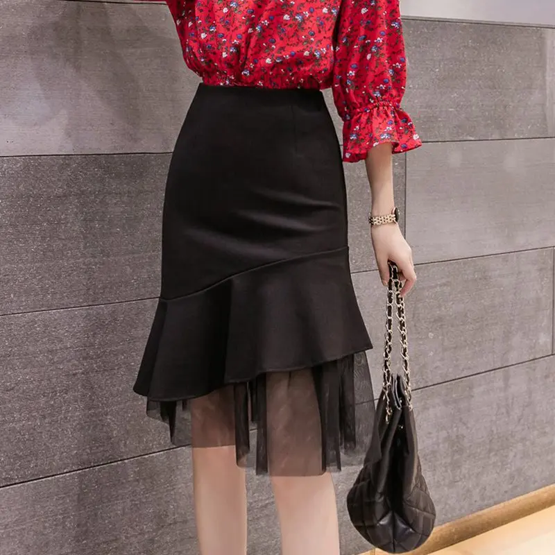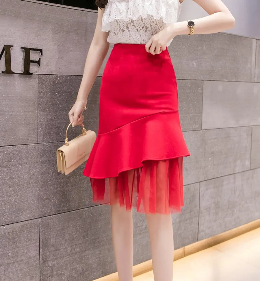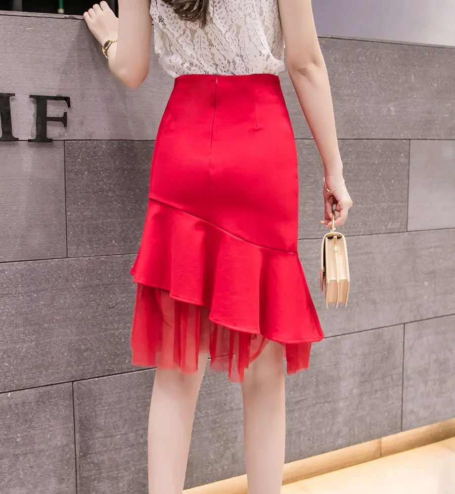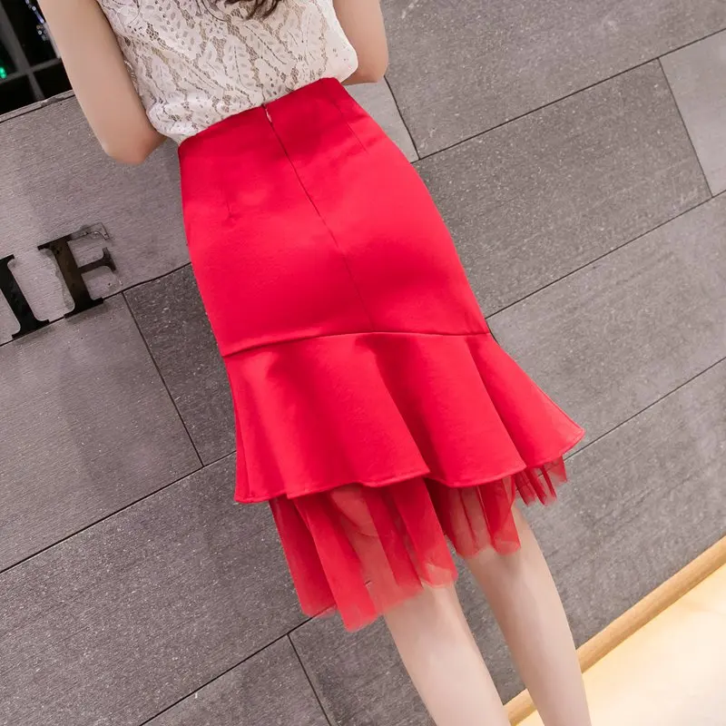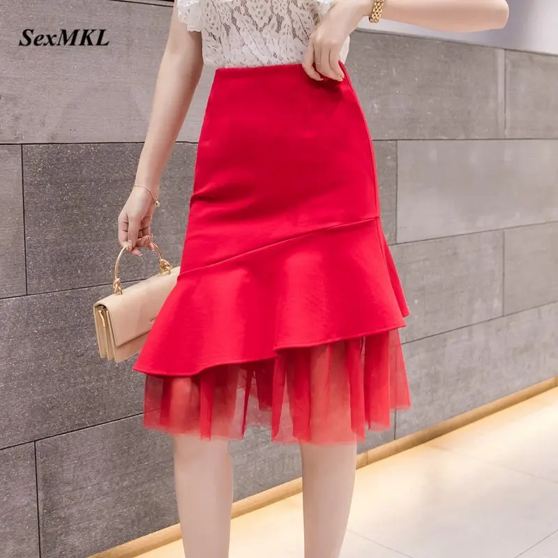Сетка Лоскутная Красные Юбки Женщины 2019 Плюс Размер Осень Зима Повседневная Юбка с Высокой Талией Черный Офис Женские Корейские Юбки-Карандаш
