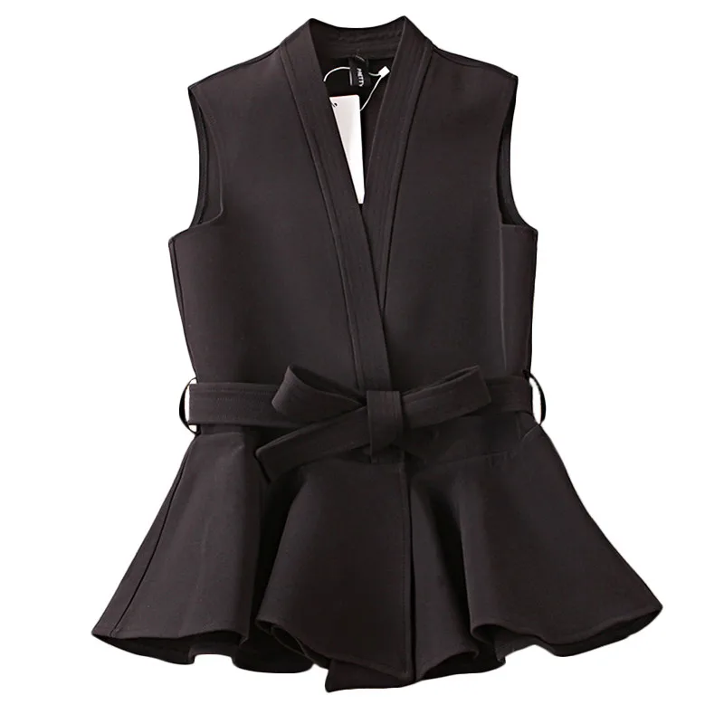 Жилет женский демисезонный, черный, без рукавов, с поясом, с рюшами, R1019, 2019