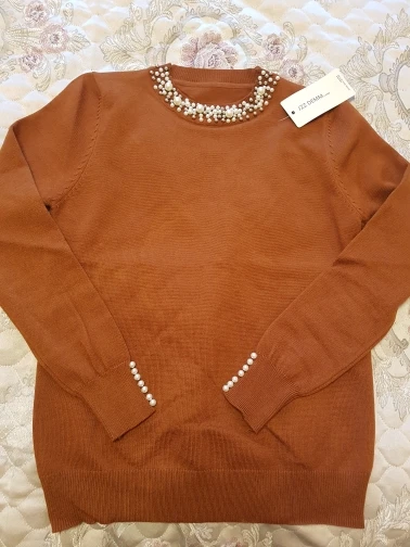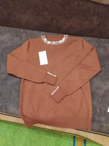 Отличный свитер!!ткань очень приятная к телу, мягкий, все бусинки хорошо закреплены, выдержали стирку!на 42 размер подошла идеально. После стирки не села и не растянулась!материал плотный