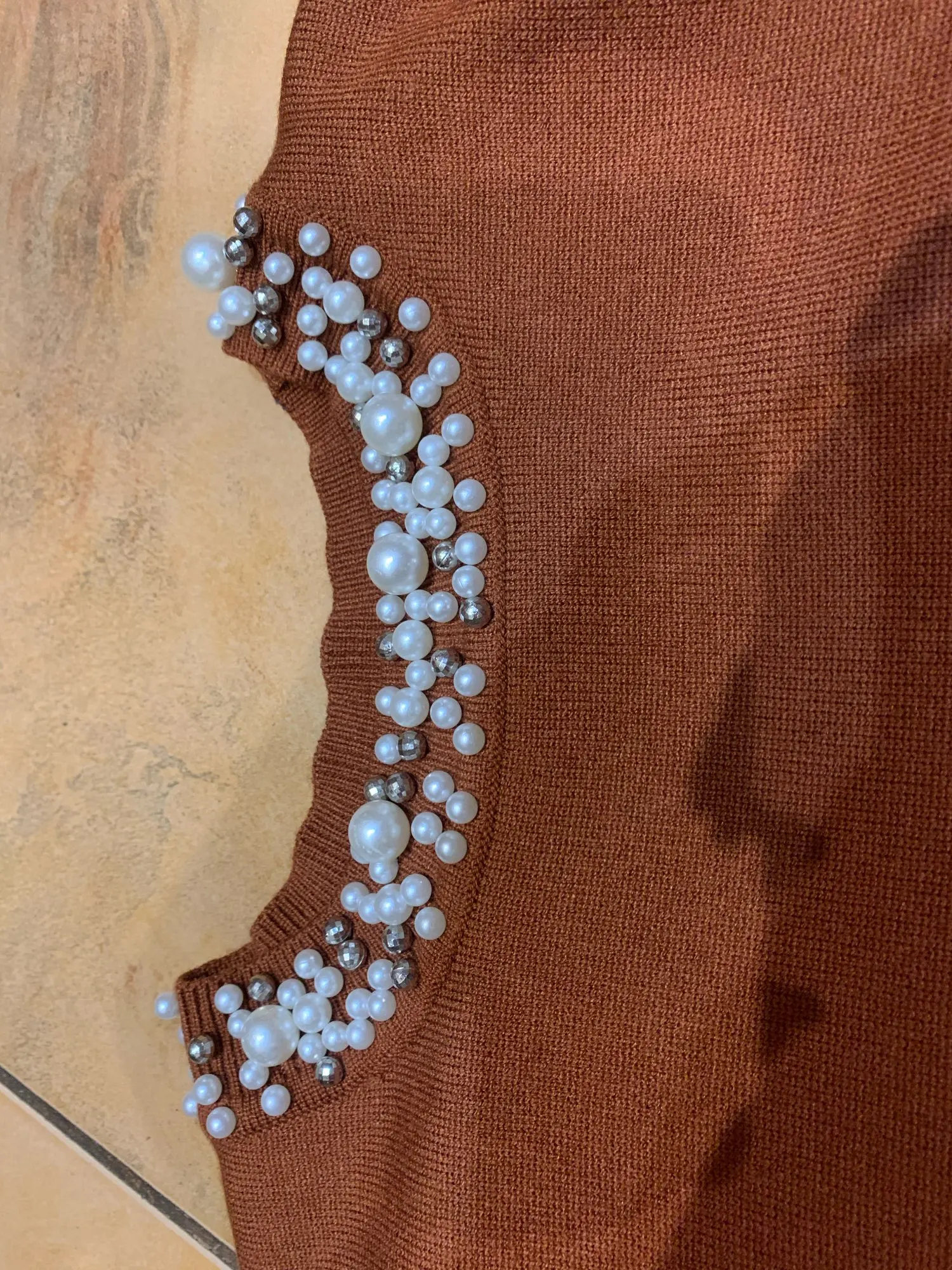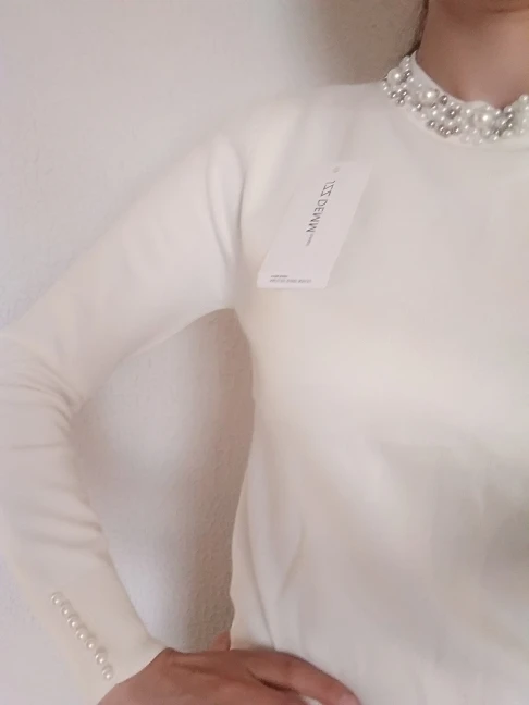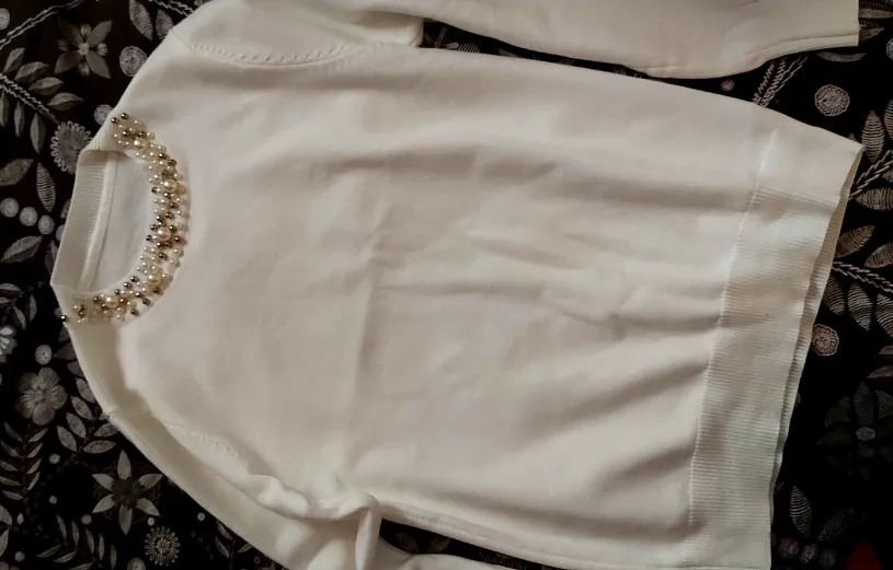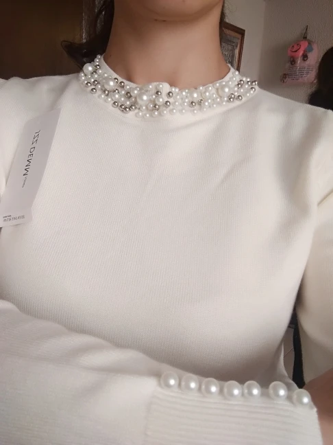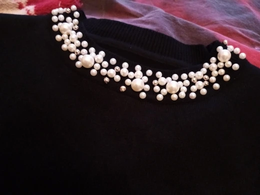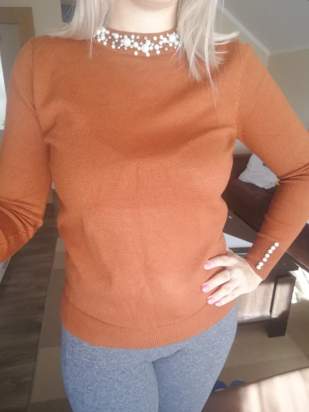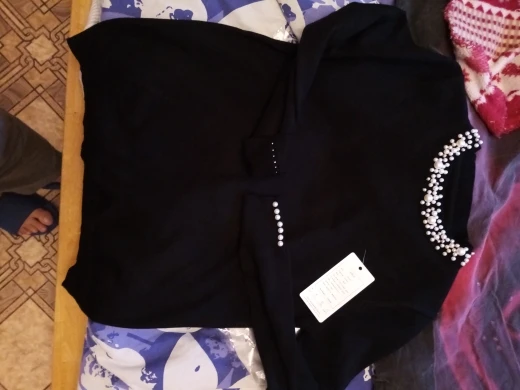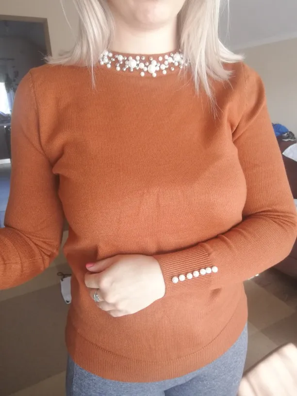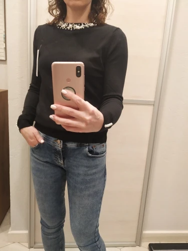 Интересная кофточка. Цвет приятный, хорошо сделаны жемчужины, они только спереди, не весь воротник. Но для совсем хорошей оценки ей не хватает большего размера и мягкости. Не очень комфортная на теле. На мои параметры 174 рост, в груди 94, 84, 104 она полностью по телу, но не давит, не жмёт и не растягивается безобразно. Но по фото продавца она прям мягкая, а жизни нет.