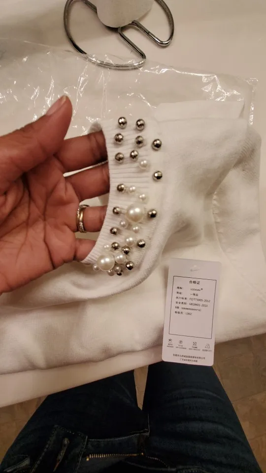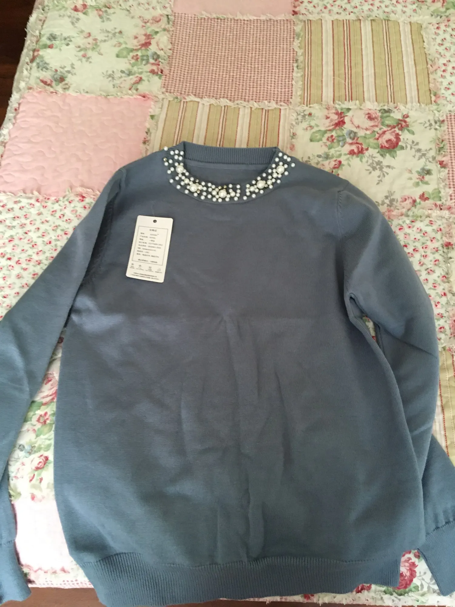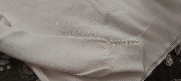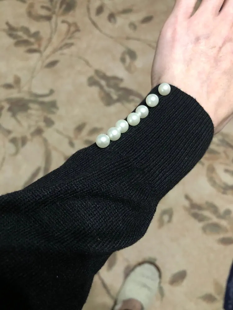 Очень красивый свитер. Я еще не помыл его, поэтому я не знаю, будет ли он просвечиваться, но на данный момент он кажется действительно мягким. Цвет точно такой же, как на фото, красивый синий. Жемчуг красивый. Раздражает то, что рукава имеют неудобную длину. Слишком короткие, как длинные рукава, но длиннее, чем рукава 3/4. Я 5'7 и обычно ношу размер S, и это хорошо сидит. Я думаю, что рукава будут слишком узкими на кого-то большего размера.