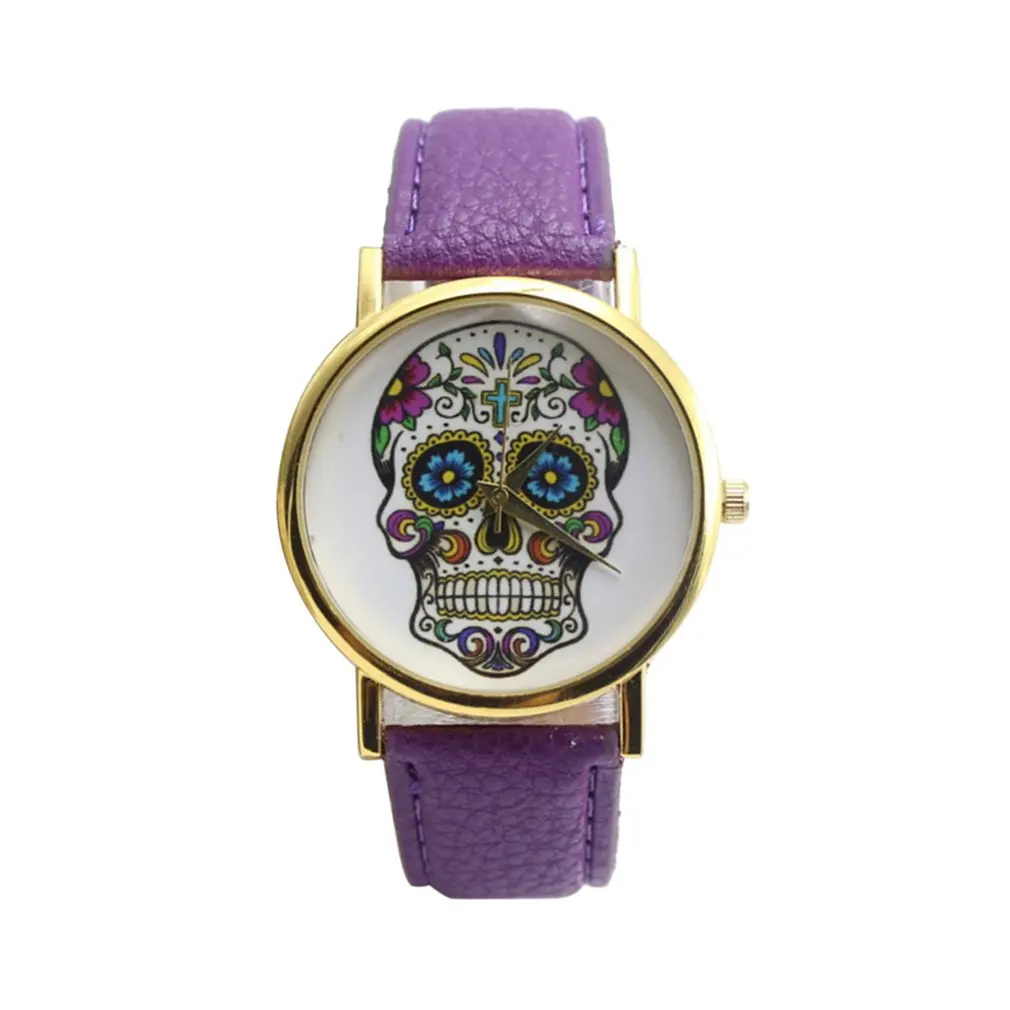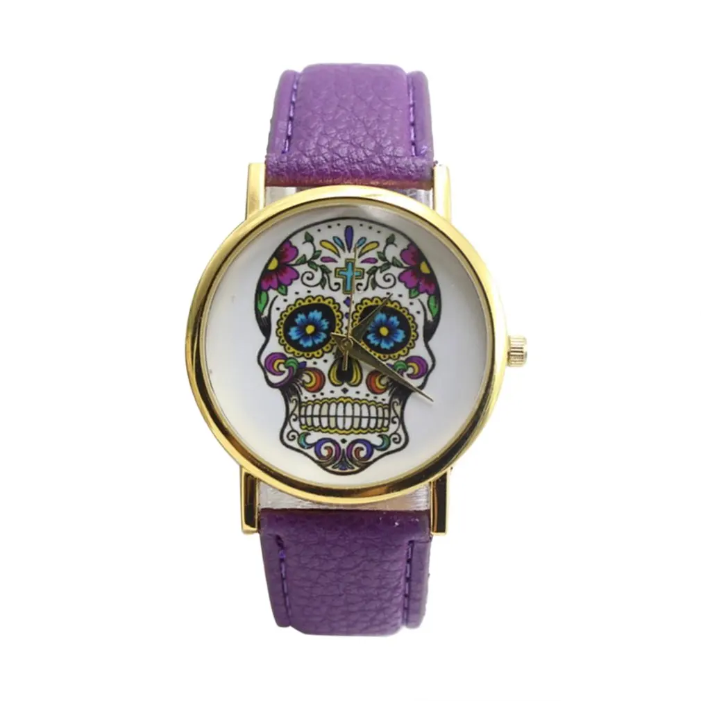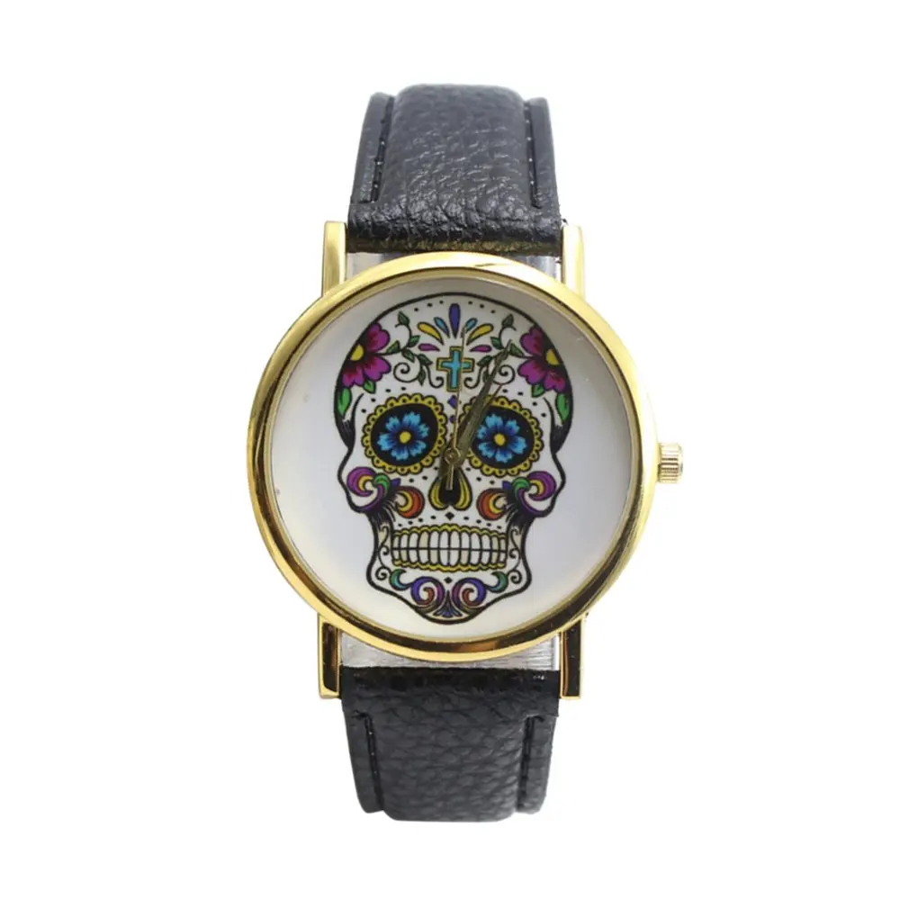 Новый Топ череп для женщин часы Мексиканская Catrina Цветы Крест из искусственной кожи наручные часы Девушка Винтаж Мода повседневное Женева Стиль Reloj