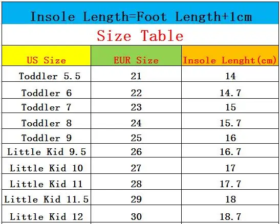 Дорогие друзья, когда вы заказываете детскую обувь, вы должны соответствовать длине стельки. (Длина стельки = длина стопы + 1 см) американский размер не является стандартным, просто удобно для вас сделать заказ. Удобная длина стопы составляет около 1 см. И из-за длительного времени доставки авиа-отправление Почты Китая и ребенок быстро вырастет, пожалуйста, выберите обувь большего размера для вашего ребенка. Пожалуйста, выберите правильный размер.