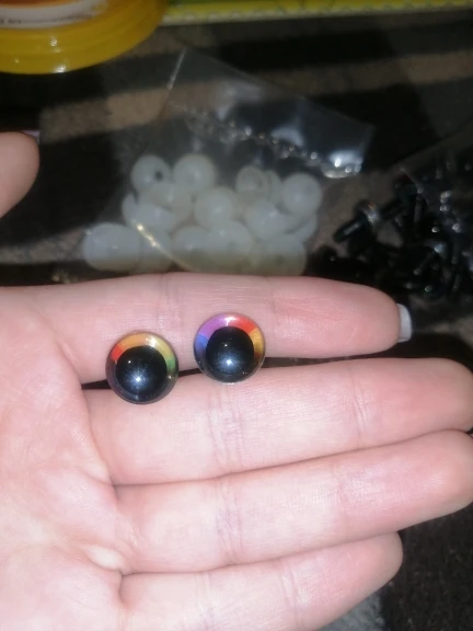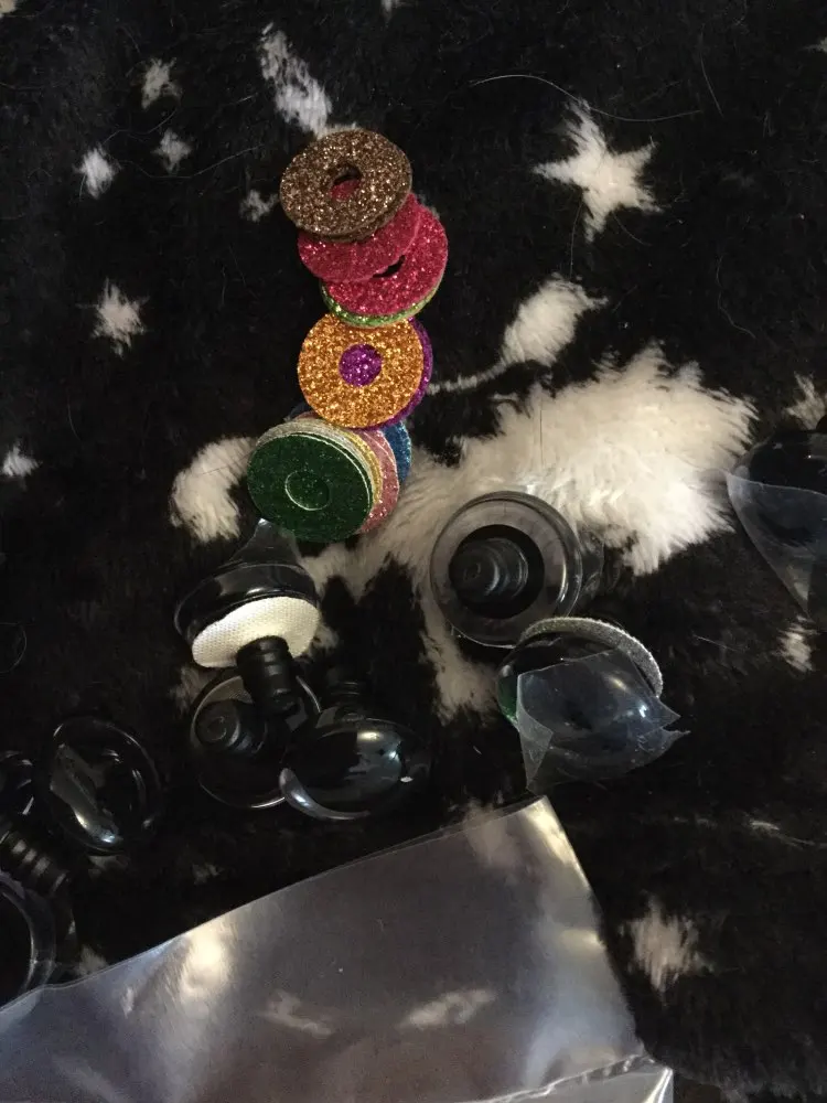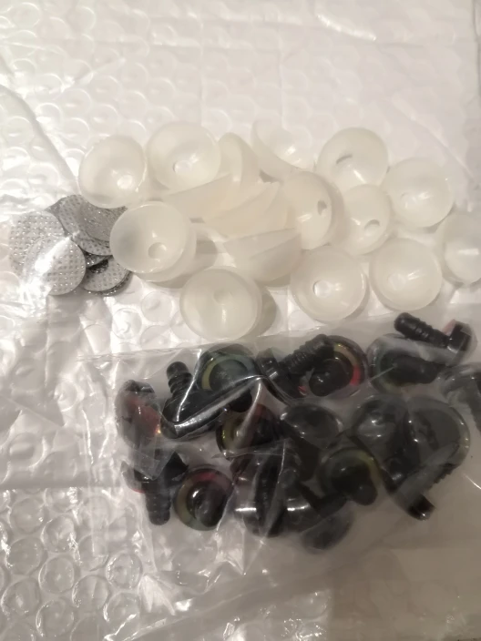 Заказывали 2 набора глаз, по 20 штук каждый: 1 с глиттером, 1 с принтами! Оба набора понравились. Продавец положил в подарок дополнительные 3 пары глаз (6 штук). Итого у нас теперь 46 разных глазок. Размер подходит, крепятся неплохо. Заглушек больше, чем нужно - есть запасные:)