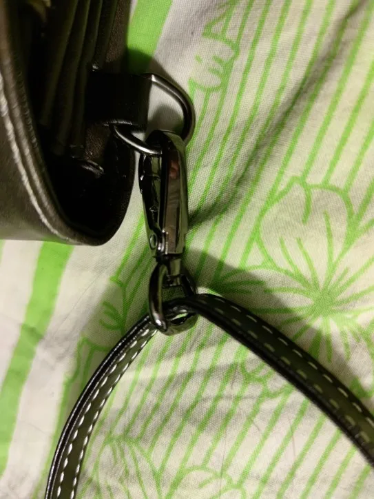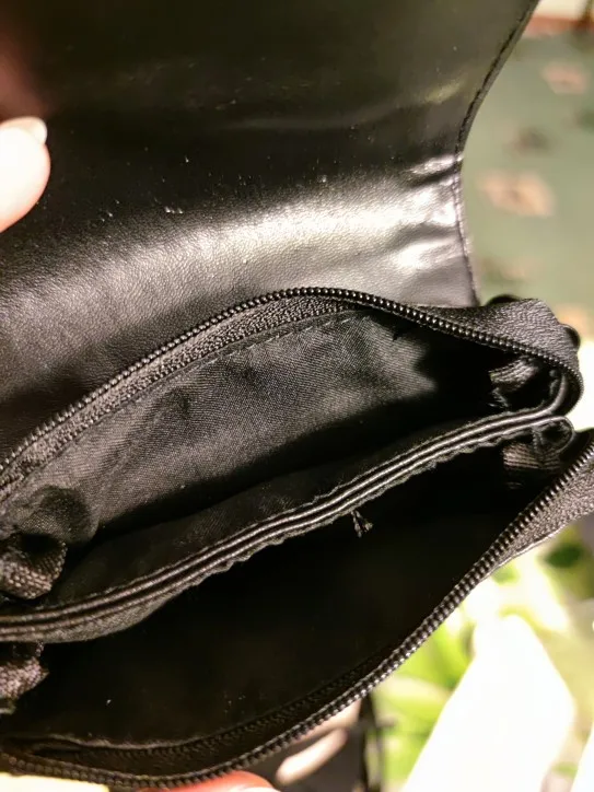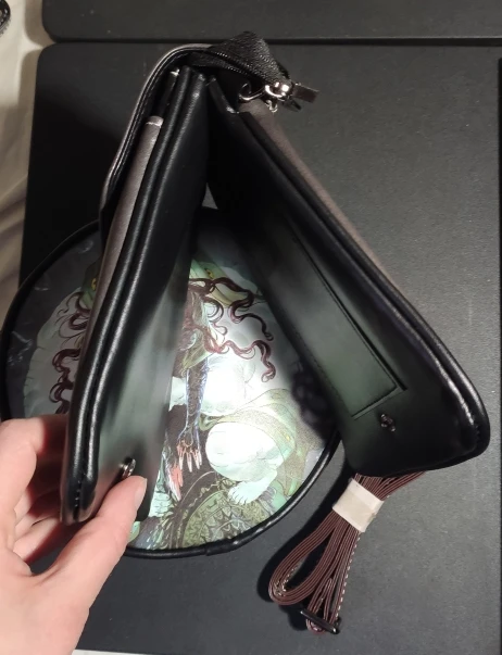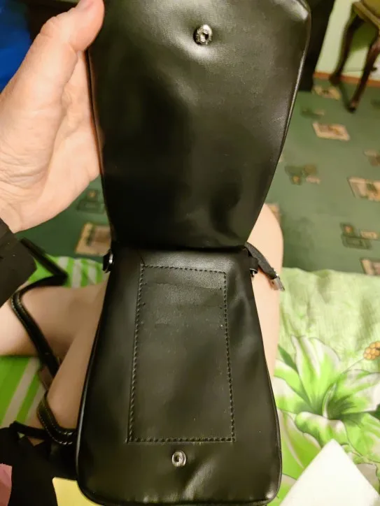 Большая, вместительная, 3 фото - скрытый отдел для карточек,не надо таскать с собой кошелёк, смартфон 6,7 входит отлично. Фурнитура и вообще качество на высоте, рекомендую однозначно! очень довольна! и очень быстрая доставка!