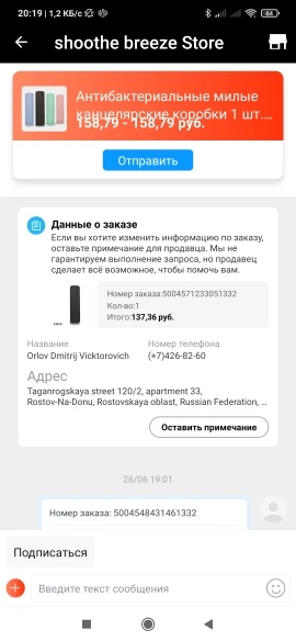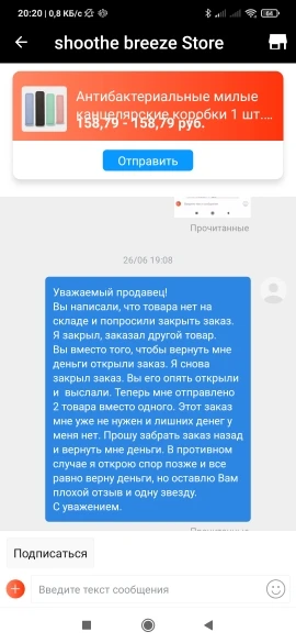 Продавец-мошеннник!!! Он попросил закрыть заказ, т.к. товара нет на складе. Я закрыл. В причинах написал, что товар отсутствует. Заказал другой товар. Потом увидел, что продавец открыл мой первый заказ. Я его снова закрыл и так три раза. В итоге вместо одного товара продавец "отправил" 2. В итоге не пришёл ни один. Деньги вернули по спору.