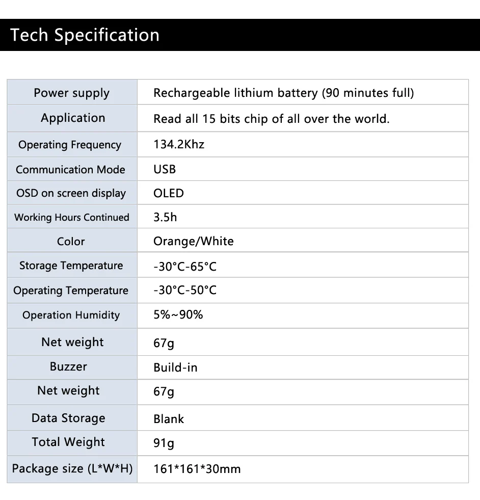 Особенности:1 маленький размер и легко носить с собой;2. Простота в эксплуатации, порт USB заряжается напрямую;3 ЖК-дисплея, прозрачный и легко читаемый;4 Поддержка стандарта ISO11784/11785 FDX-B иПредоставление доверия вашим потенциальным пользователям.