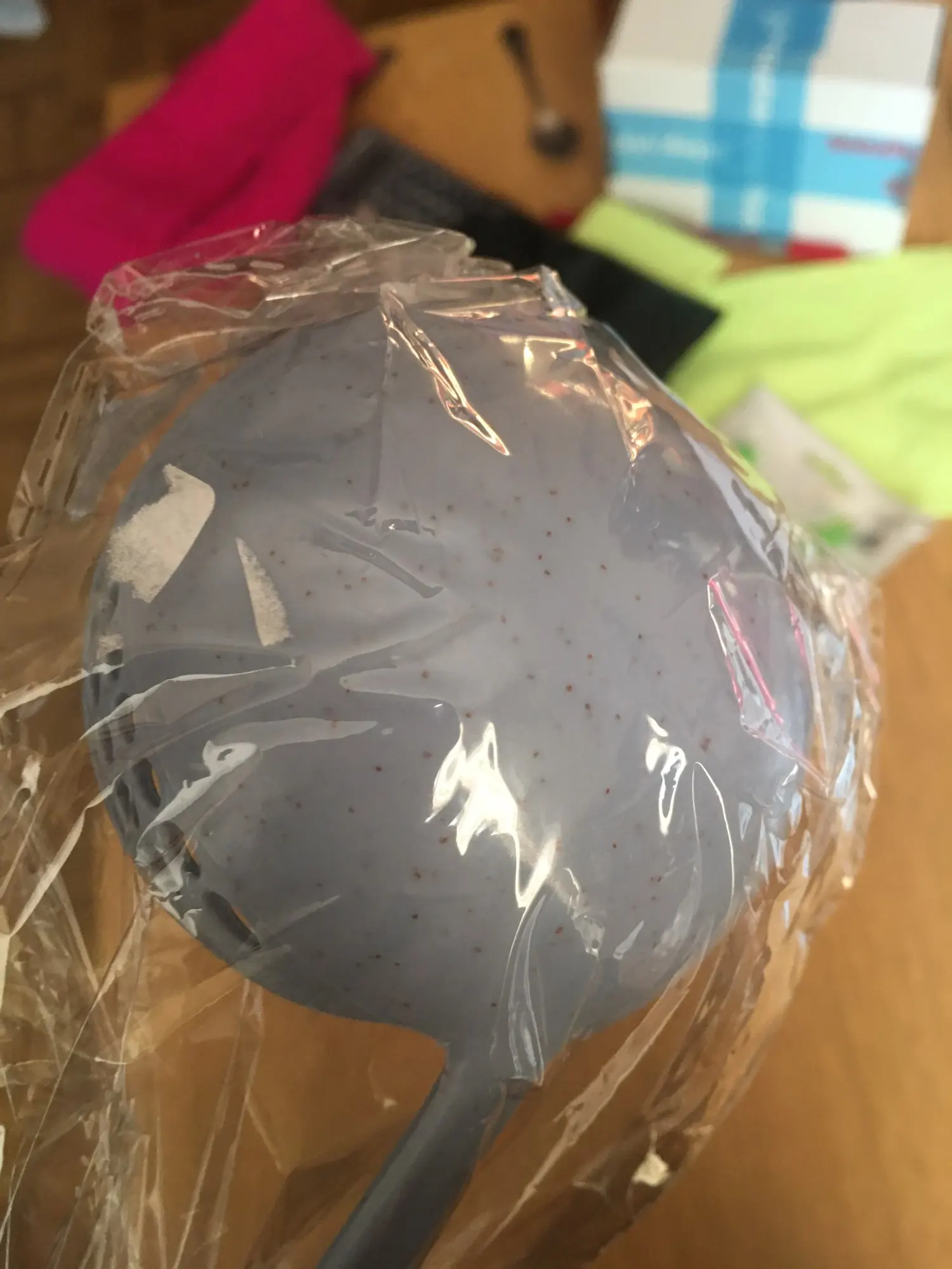 пришло за две недели, хорошо упаковано, половник целый, без запаха. спасибо продавцу
