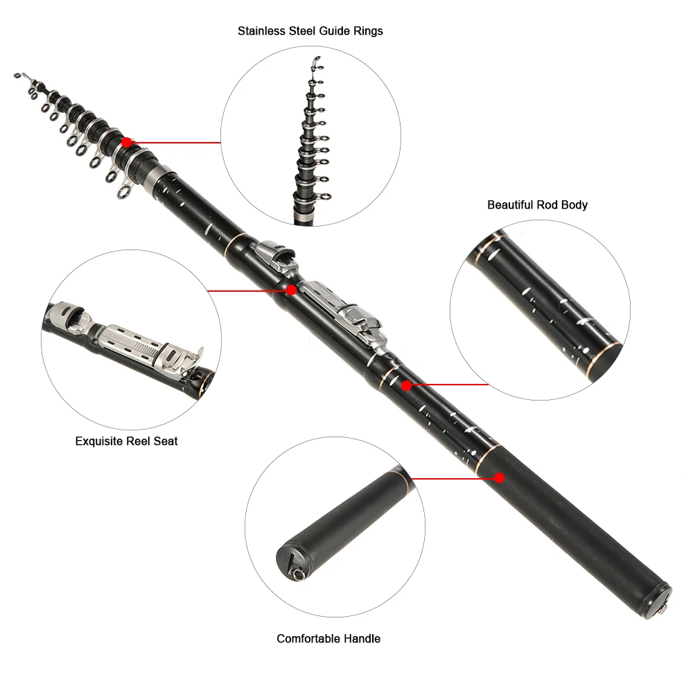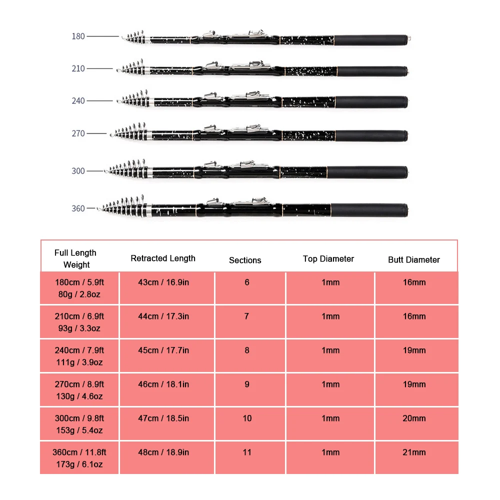 Эта Удочка имеет прочную конструкцию из углеродного волокна и телескопическую длину, что делает ее идеальной для морской, речной, пруда, озерной рыбалки. Особенности:Эта Удочка изготовлена из углеродного волокна, прочная и легкая.Направляющие из нержавеющей стали и сиденье катушки.Телескопическая удочка для ситуаций, когда полная длина не удобна.Портативный дизайн с закрытой длиной для удобной переноски.Хорошо подходит для морской, речной, пруда, озерной рыбалки.Прекрасный подарок для любителей рыбалки или коллекционеров. Технические характеристики:Материал: углеродное волокно и нержавеющая стальДлина: 1,8 м/2,1 М/2,4 м/2,7 м/3,0 м/3,6 м (опционально)Вес упаковки: 105g-205g/3,7 oz-7,2 oz Детали:Полная длина ----- убираемая длина ---- секции ---- верхний диаметр ----- диаметр стыка ----- вес180 см/5.9ft ----- 43 см для ухода за ребенком для мам/16.9in ---- 6 ---- 1 мм ----- 16 мм ----- 80 г/2,8 унции210 см/6.9ft ----- 44 см/17.3in ---- 7 ---- 1 мм ----- 16 мм ----- 93 г/3,3 oz240 см/7.9ft ----- 45 см/17.7in ---- 8 ---- 1 мм ----- 19 мм ----- 111g/3,9 oz270 см/8.9ft ----- 46 см/18.1in ---- 9 ---- 1 мм ----- 19 мм ----- 130g/4,4 oz300 см/9.8ft ----- 47 см/18.5in ---- 10 ---- 1 мм ----- 20 мм ----- 153g/5,4 oz360 см/11.8ft ----- 48 см/18.9in ---- 11 ---- 1 мм ----- 21 мм ----- 173g/6,1 oz В комплект входит:1 * удочка