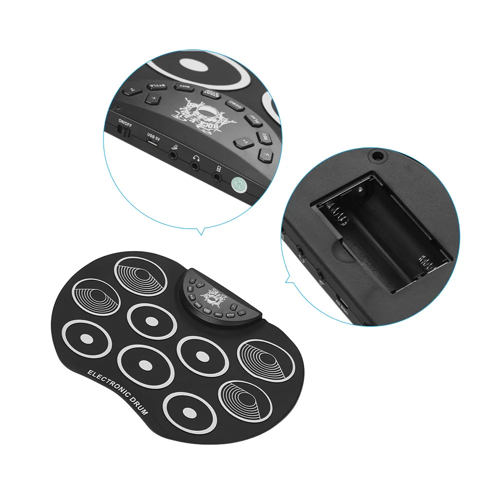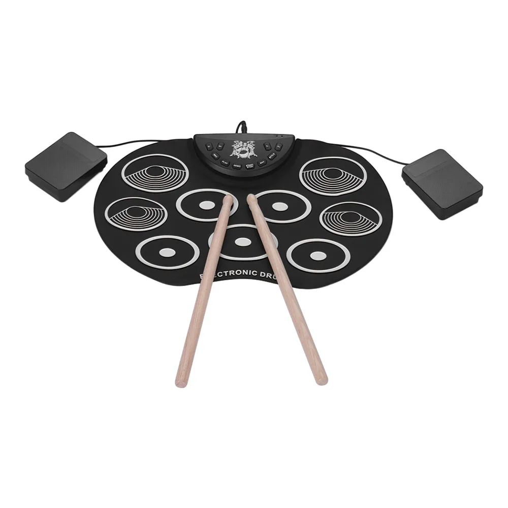 Складная ударная установка, 9 силиконовых колодок, питание от USB и аккумулятора, с палочками, педали для детей, для детей, набор электронных ударных