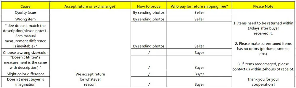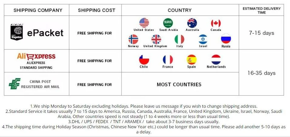 2. Пожалуйста, дайте нам знать, прежде чем оставить отрицательный отзывы или 1 точку, 2 точки низкого DSR или открыть любые споры на Paypal и Ebay, пожалуйста, дайте нам возможность решить любые проблемы, и мы постараемся сделать все возможное, чтобы удовлетворить ваши потребности.3. Если у вас возникнут какие-либо вопросы, пожалуйста, свяжитесь с нами через «задать продавцу вопрос», мы постараемся ответить на ваши письма как можно скорее, из-за большого объема ежедневных входящих писем и разницы в часовых поясах, Мы не можем ответить на ваши письма немедленно. Пожалуйста, дайте нам 1-2 рабочих дня для ответа.