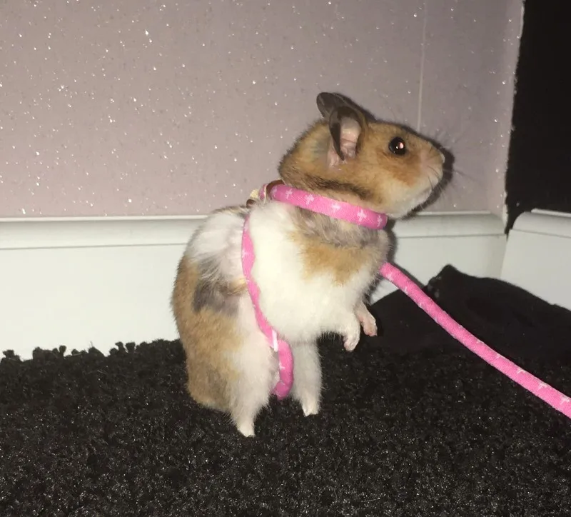 Точное описание. Очень регулируемый, это будет работать для карликовых или китайских хомяков и крыс. Мой гномик очень дружелюбный, поэтому его легко использовать с ней, но с хомяками, которые кусают, будет трудно надеть их. Поводок немного короткий. Хорошо упакован и пришел вовремя.