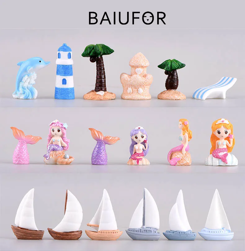 Миниатюрный Дельфин-Русалка BAIUFOR, лодка, маяк, кокосовое дерево, декор Морского Пейзажа, аксессуары для террариума, фигурки