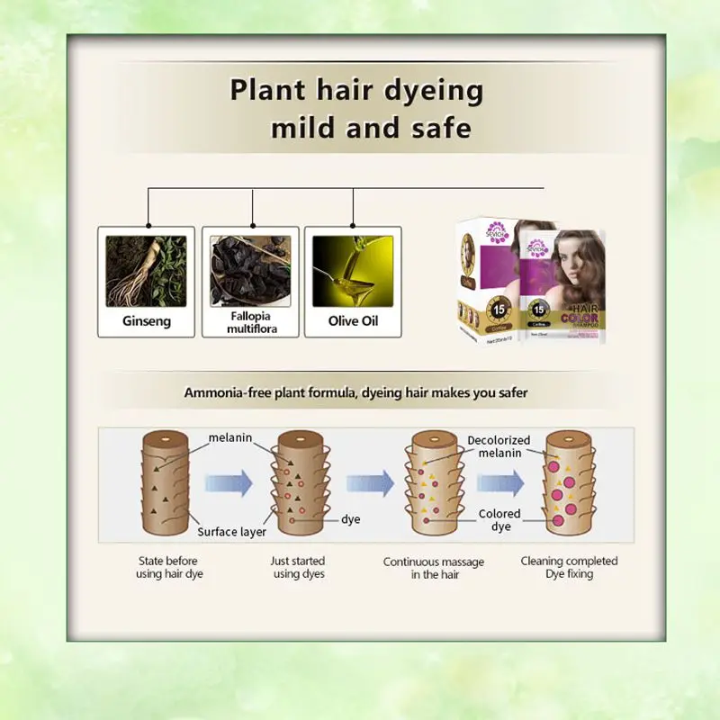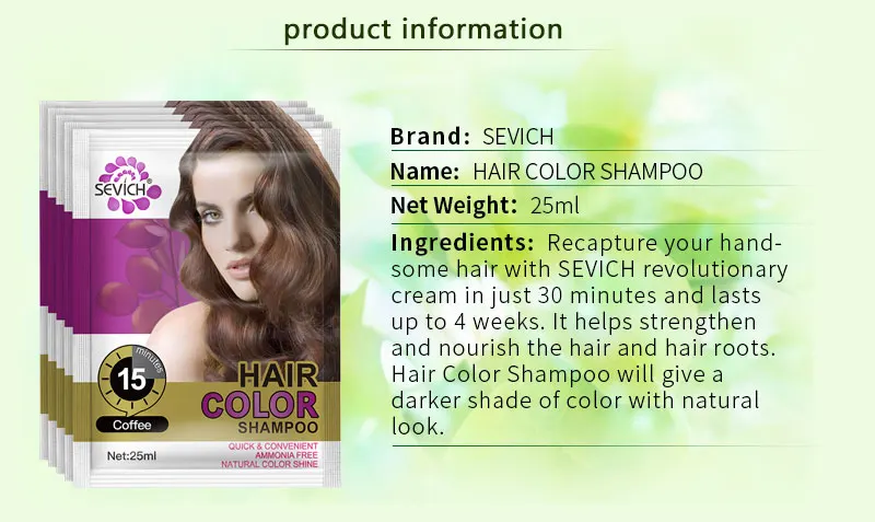 Шампунь для волос-это своего рода шампунь, который может окрасить волосы в цвет в течение 15-25 минут и специально разработан, чтобы сделать ваши волосы блестящими только через обычный процесс мытья волос в ванной комнате. Шампунь Sevich цвета волос нетоксичный с высокой технологией. Также питает, защищает и восстанавливает кожу головы. По сравнению с традиционной краской для волос, она имеет преимущество низкой стоимости, экономит время. 1. Удобная Легко в эксплуатации, наденьте пластиковые перчатки, прежде чем открывать пакетик. Протрите в течение нескольких минут, так же, как с помощью нормального шампуня. 2. Экономия времени Используйте только один раз, чтобы придать цвет сияющим волосам за 15-25 минут. 3. Экономия затрат По сравнению с дорогой стоимостью окрашивания волос в парикмахерской, черный шампунь для волос более чем в 10 раз дешевле. 4. Бесплатные пластиковые перчатки 15-25 минут окраски волос. Легко окрашивается, легко стирается, Длительное хранение быстрое окрашивание волос Моде! Легко! Удобно! Будьте разными! Меры предосторожности: 1. Избегайте контакта с глазами. 2. Только для внешнего использования. 3. Держите подальше от детей. Эти продукты имеют черный, золотой, каштановый, коричневый, красный, кофейный цвет, и если вы попытайтесь покрасить его, не получите хороший эффект, пожалуйста, повторите попытку и подождите около 15-25 минут перед стиркой.