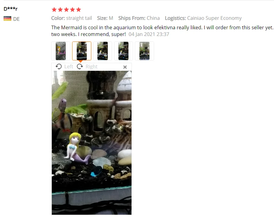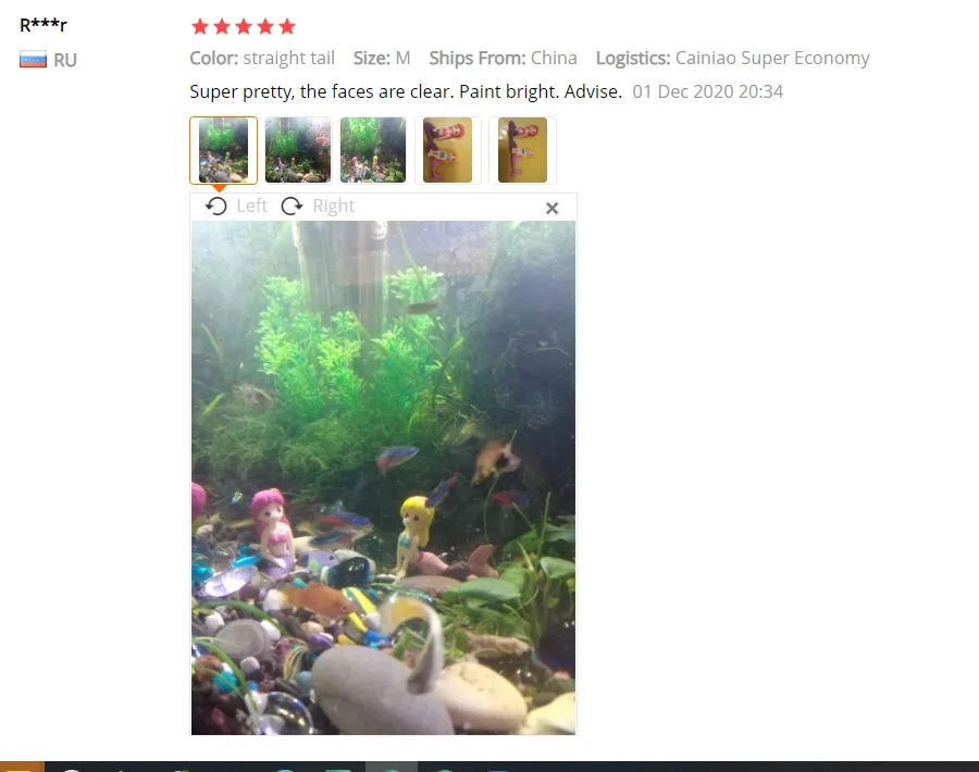 русалочка очень ,очень понравилась,хорошенькая,миленькая ,прокрашена качественно ни одного нарекания,сидит в аквариуме как живая,рыбам вроде нравится и они живы что самое главное,запаха нет. товар пртшол за 13 дней. рекомендую однозначно!