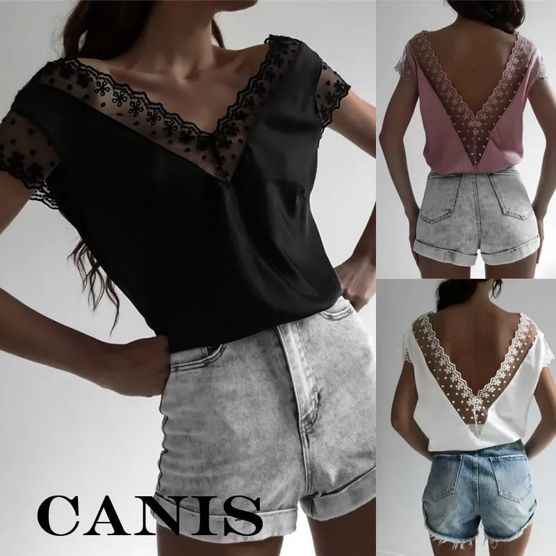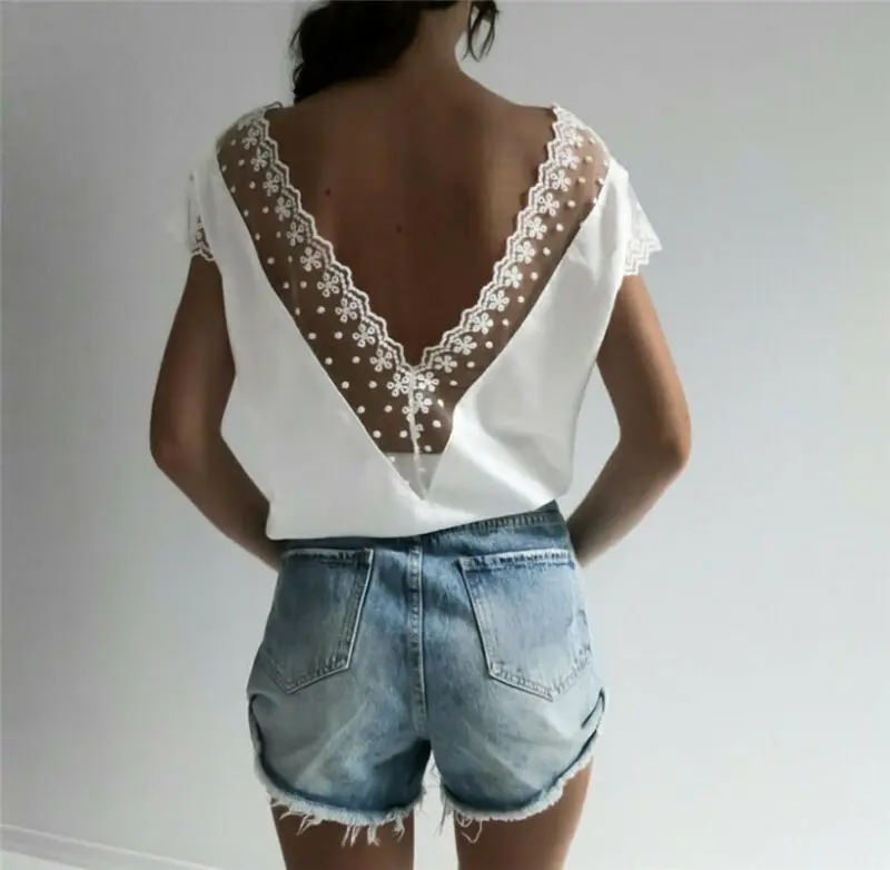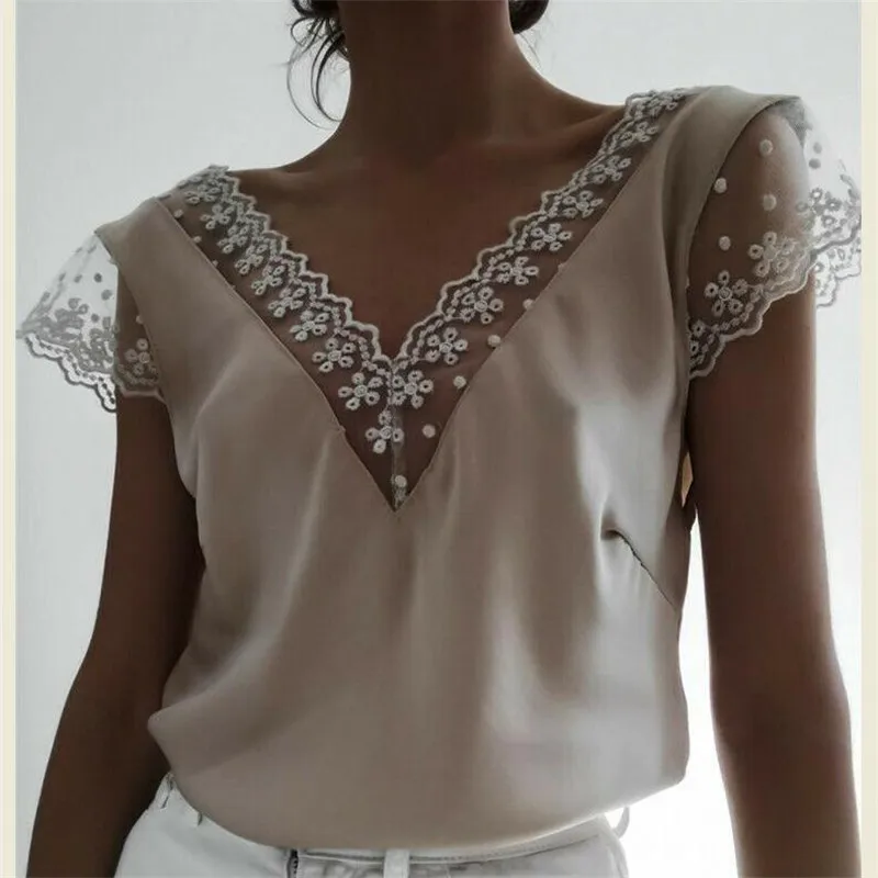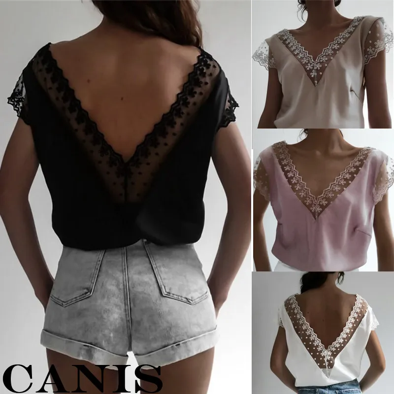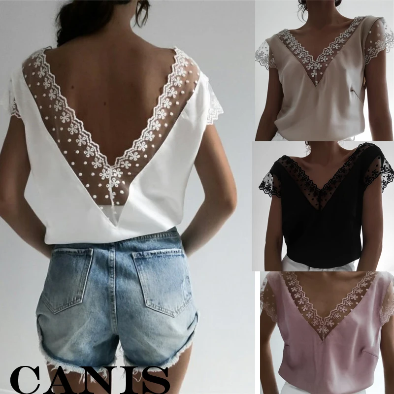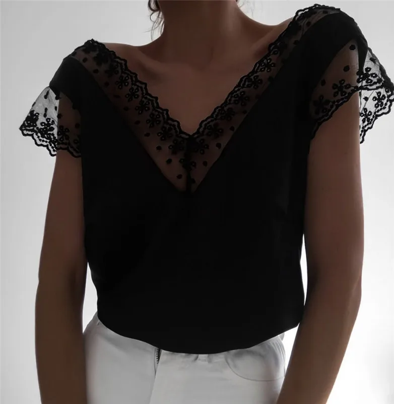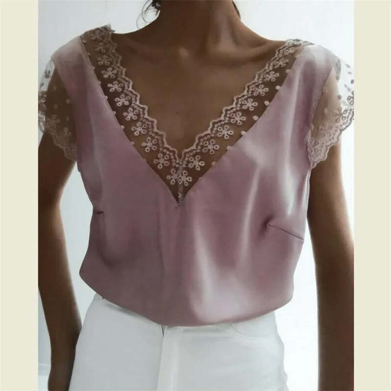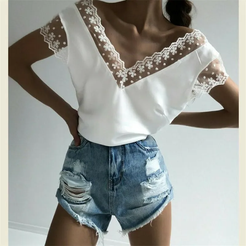 2019 сексуальные топы женские свободные футболки с коротким рукавом летние женские повседневные футболки с v-образным вырезом Топы однотонные кружевные лоскутные Футболки Сарафаны