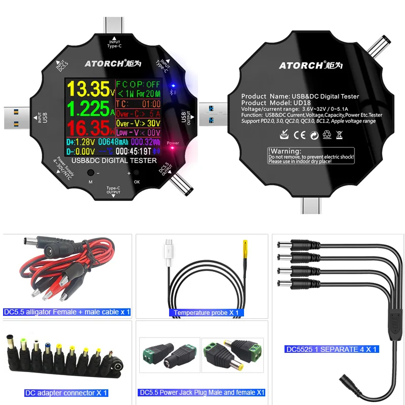 Через тестер UD18 вы можете протестировать ноутбуки, автомобильные аварийные источники питания, роутеры и другие продукты постоянного тока, мониторинг в реальном времени тока, напряжения, мощности, емкости, мощность и другое состояние зарядки!