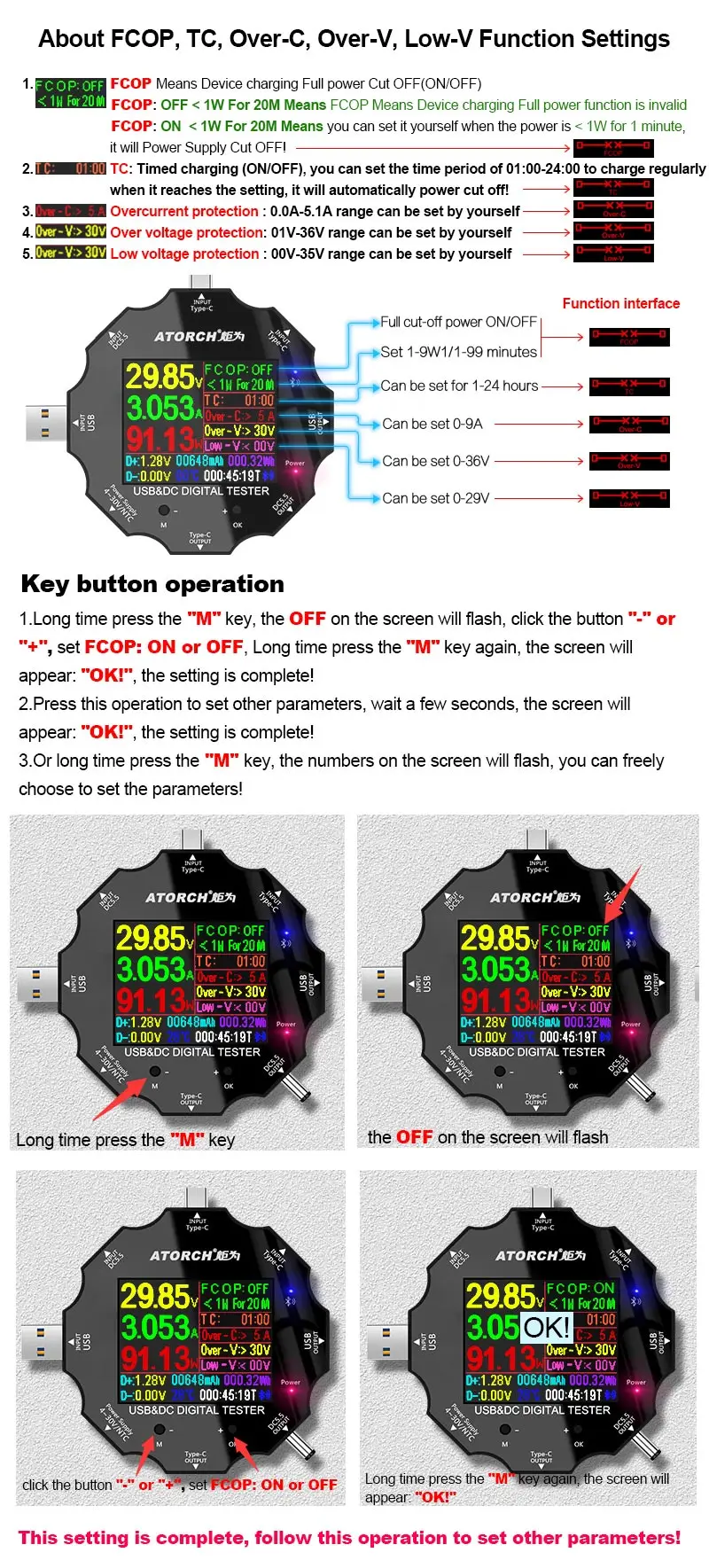 Нажимая кнопку, Переключайте различные измерительные интерфейсы, тестовый ток, напряжение, мощность, время, емкость, мощность, температуру и другие тесты данных, и можете установить полное выключение питания, синхронизацию зарядки, защита от перегрузки по току, защита от перенапряжения, защита от низкого напряжения и другие функции. Полная защита ваших зарядных устройств