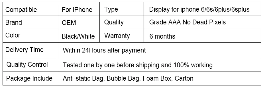 Номер моделиDisplay For iPhone 6/6s/6plus/6splus Screen Replacement