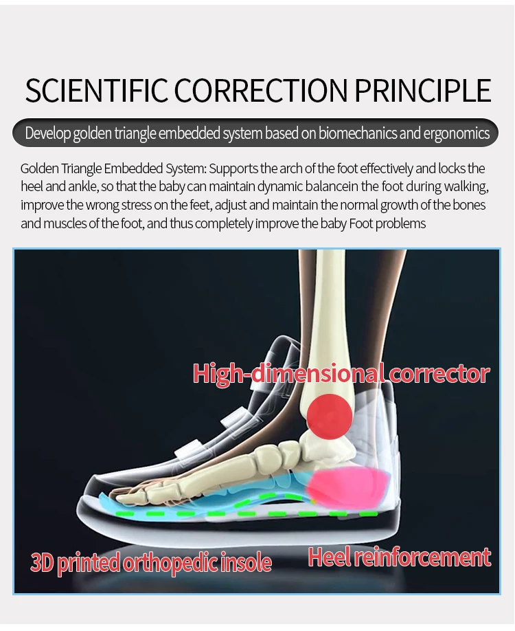 Разработка встроенной системы золотого треугольника на основе биомеханики и эргономикиВстроенная система золотого треугольника: эффективно поддерживает свод стопы и фиксирует пятку и лодыжку, чтобы ребенок мог поддерживать динамический баланс в стопе во время ходьбы, Снимает неправильное напряжение на стопах, регулирует и поддерживает нормальный рост костей и мышц стопы и тем самым полностью решает проблемы с ногами ребенка