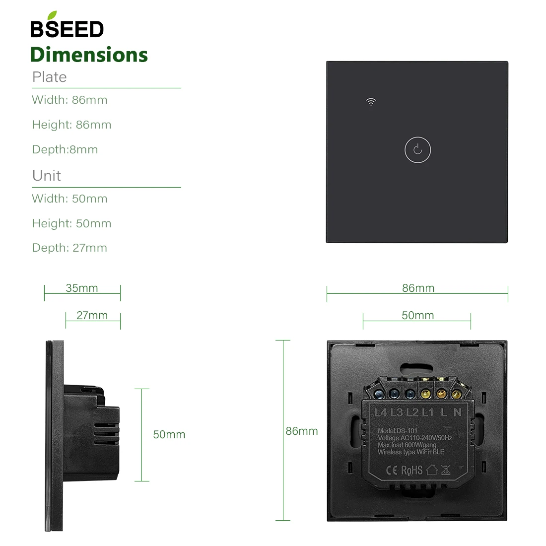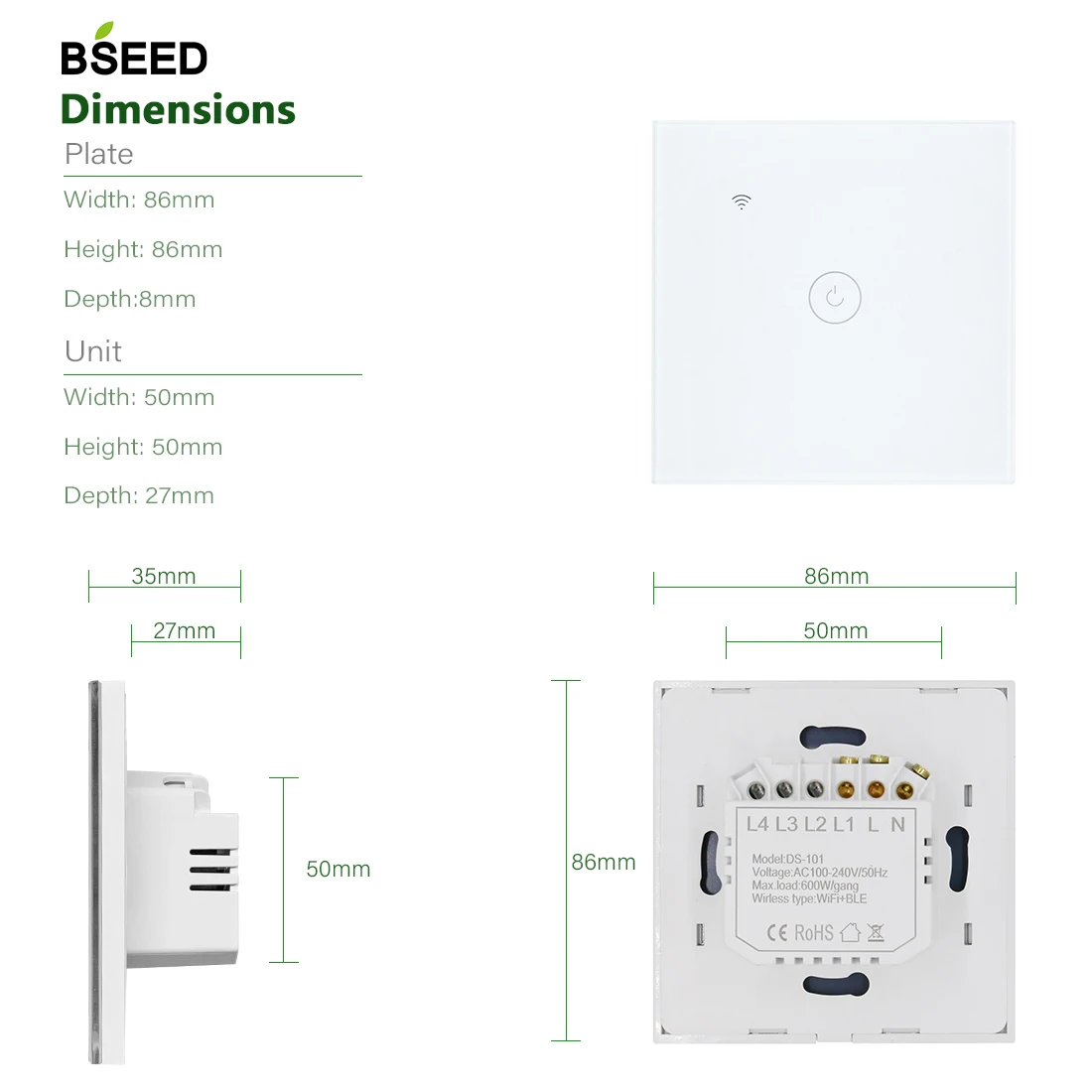 Настенный умный сенсорный выключатель BSEED, 2 упаковки, 1 клавиша,...
