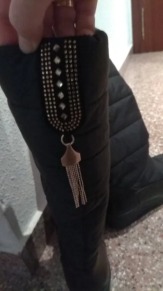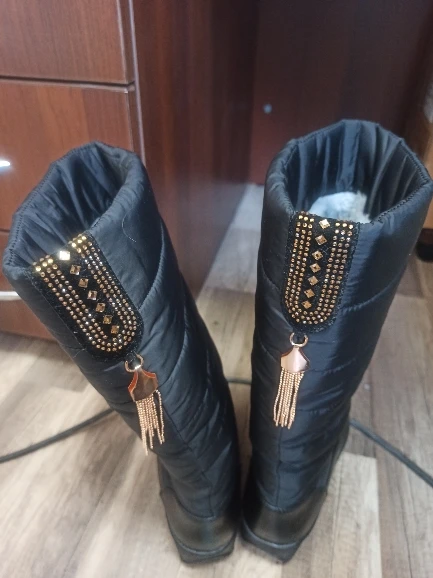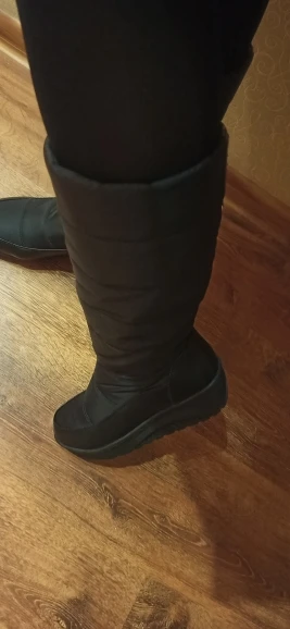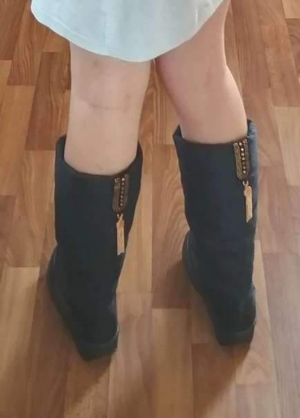 Хорошие сапожки, легкие и теплые, подойдут и на широкую ногу, у меня нога худенькая - немного свободны в голенище, но ничего не задувает и не смотрятся "карандаши в стакане". Сзади стильненькие висюльки, я хожу по улице - все смотрят (у меня и пуховик, и шапка-ушанка красные, все в одном стиле). В общем, зачетные сапоги. Идут размер в размер, и пришли быстро, где-то около 2 недель, хотя еще перед новым годом заказывала, но приехали они сразу после праздников, трек отслеживался до дома. В подарок продавец положил 2 резиночки с украшениями, приятный бонус.