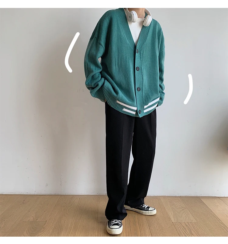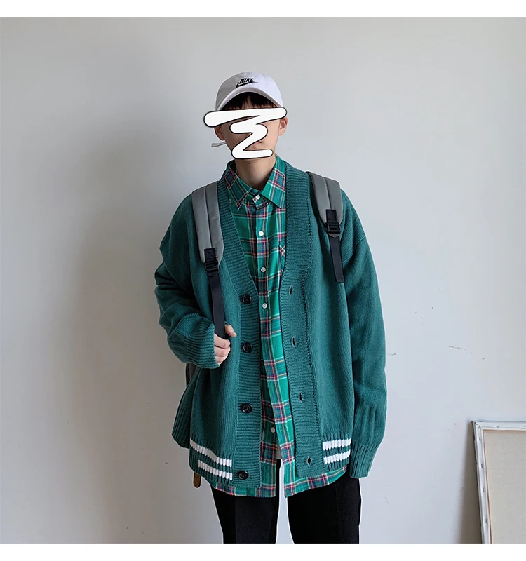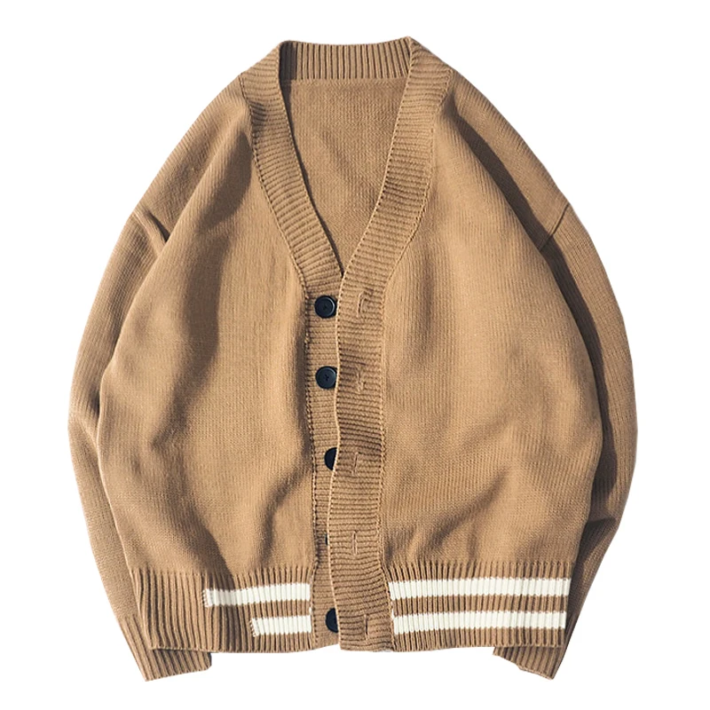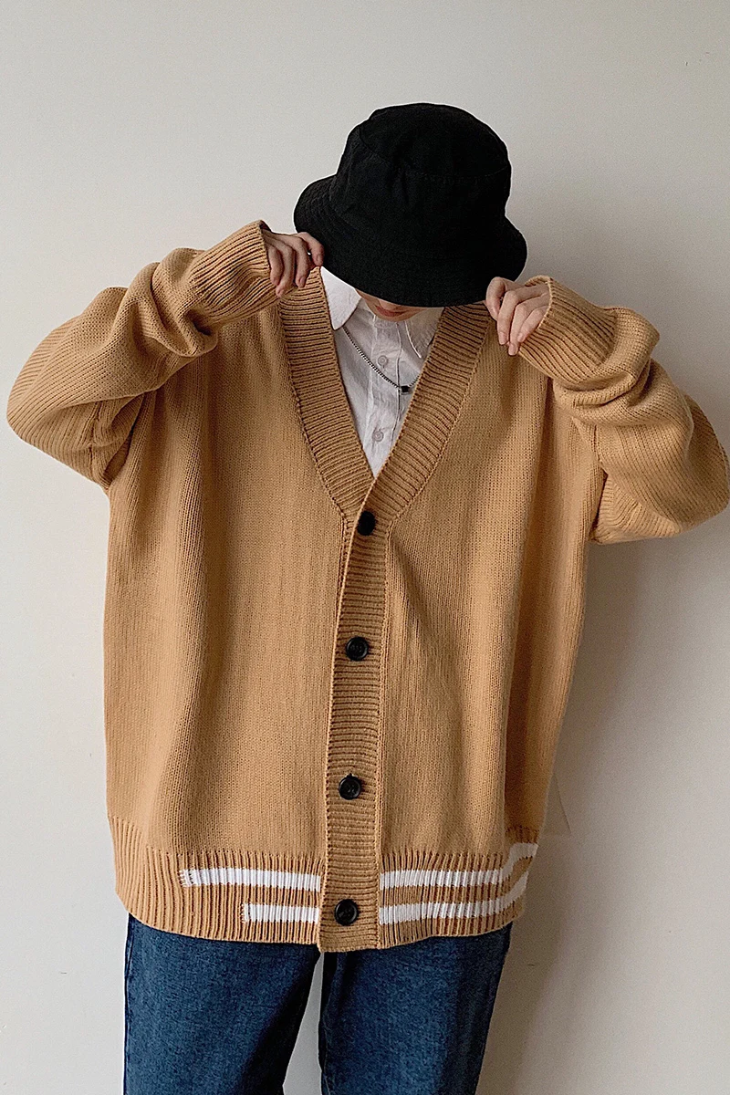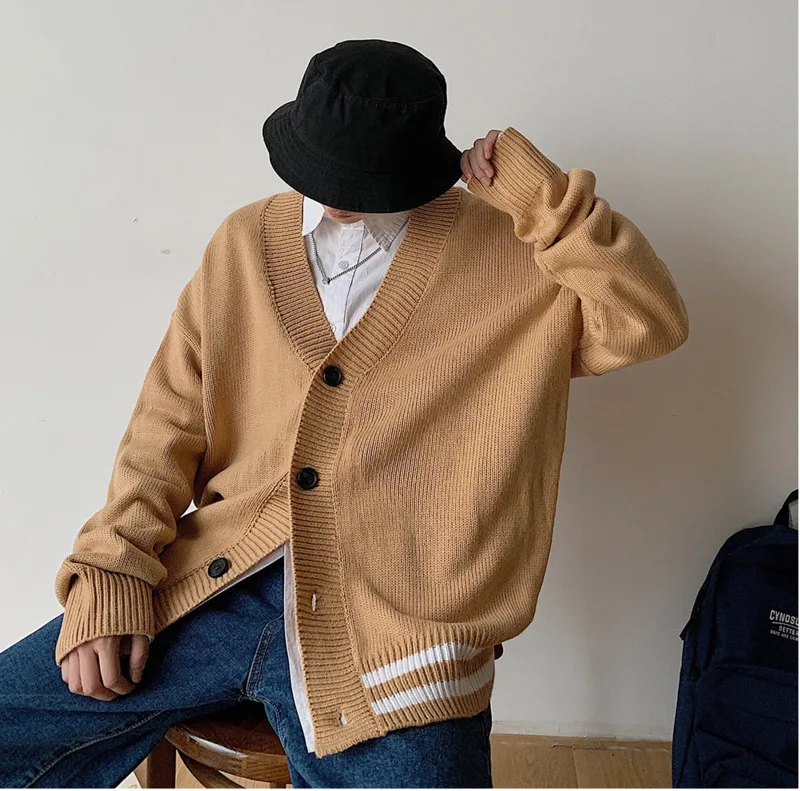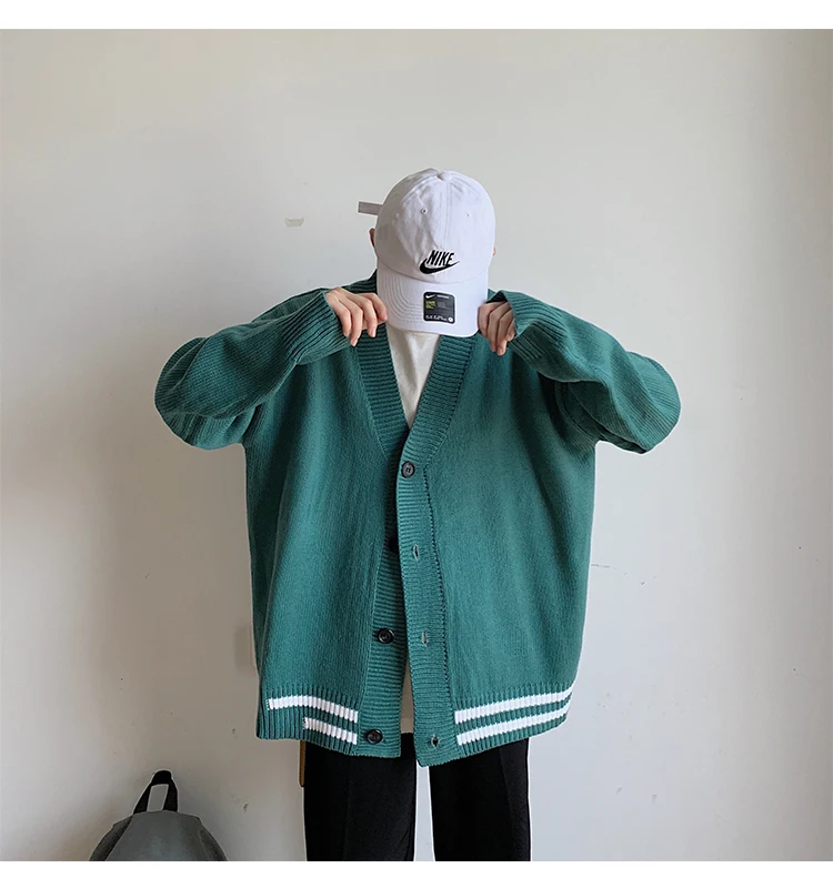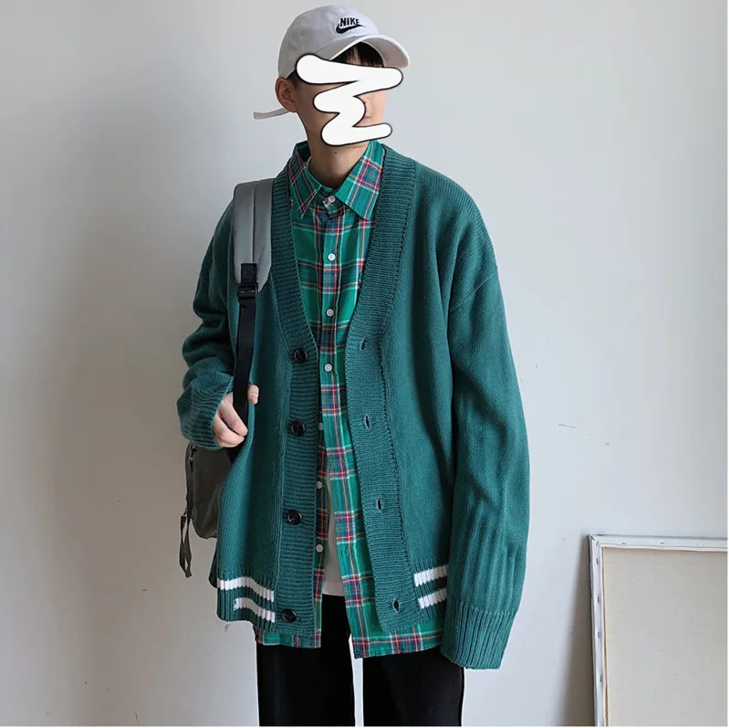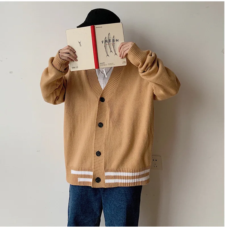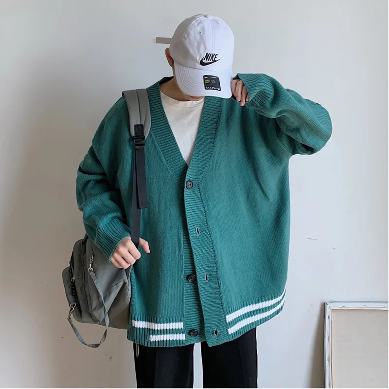 Мужской кардиган с v-образным вырезом, свободный свитер в Корейском стиле, куртка цвета хакизеленый, M-2XL, Осень-зима 2019