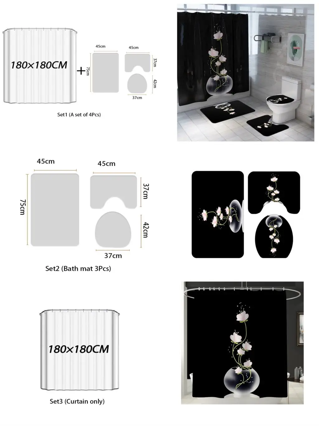 Посылка включает: Набор 1 (набор из 4 шт.):1 * коврик для ванной комплект из 3 предметов +1 шт. * занавеска для душа +Крючки Набор 2 (коврик для ванной 3 шт.):1 * коврик для ванной 3 штуки в комплекте Комплект 3 (только занавеска):1 шт. * занавеска для душа +Крючки