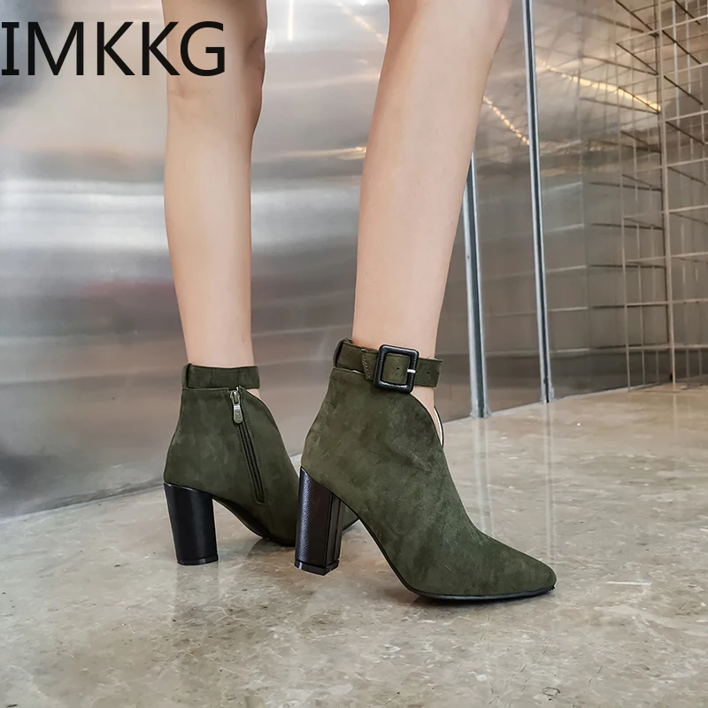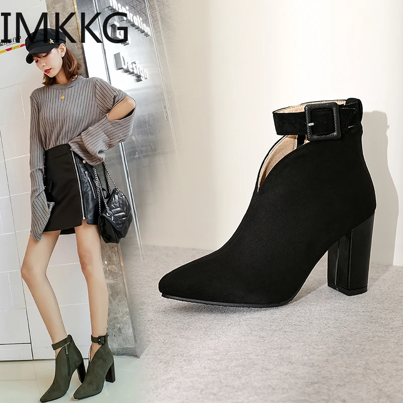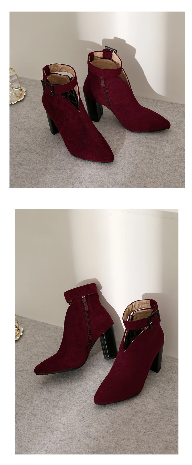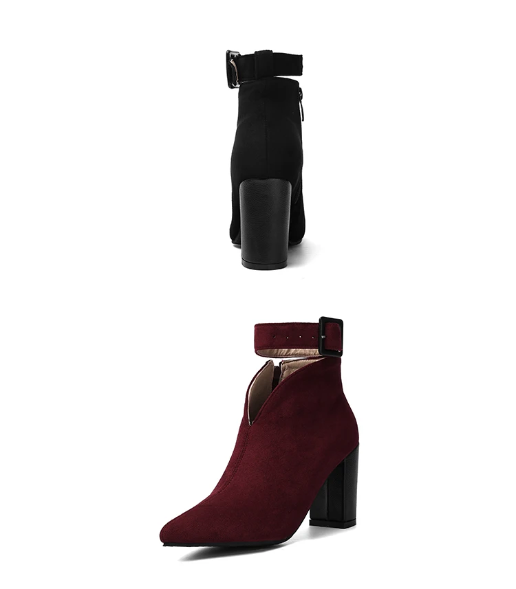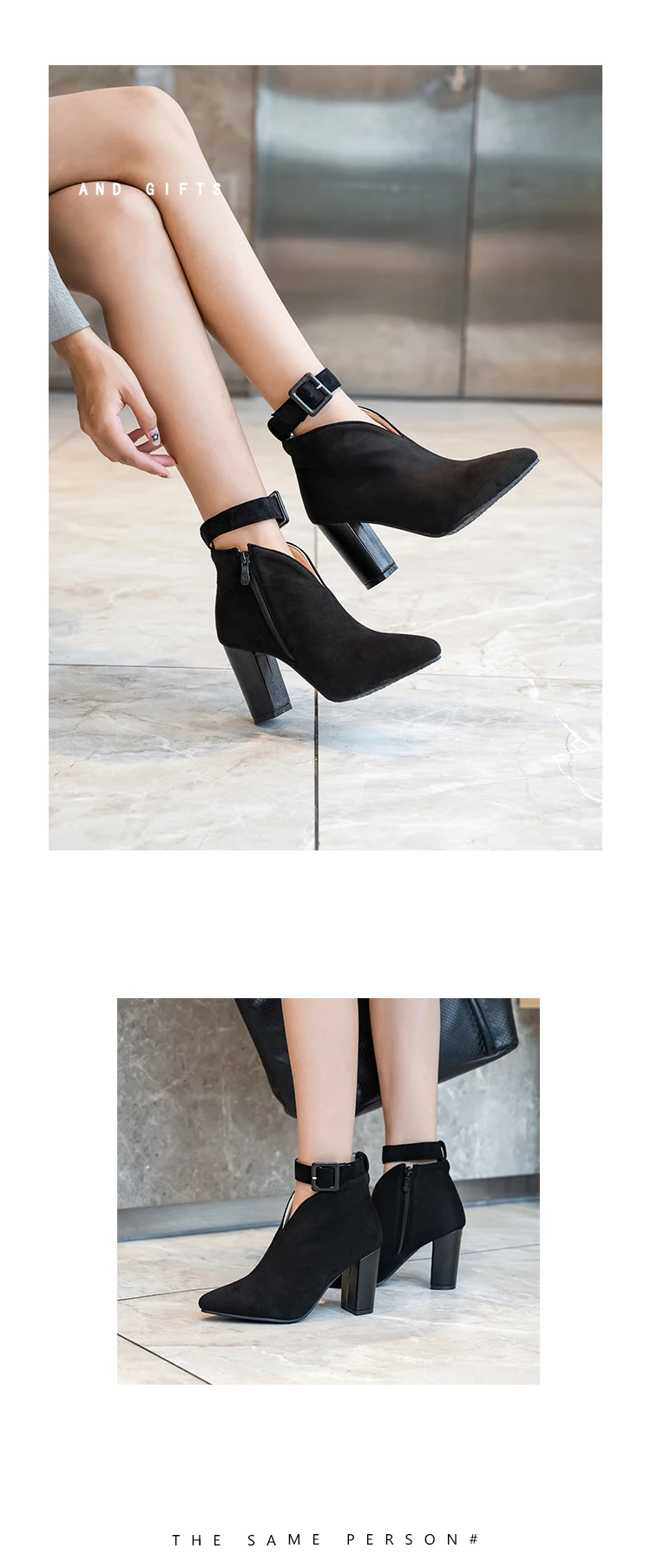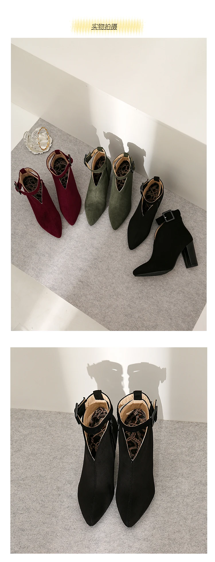 Женские ботинки на молнии, с острым носком, на квадратном каблуке, с пряжкой, с V-образным вырезом, Q00263, Осень-зима 2020